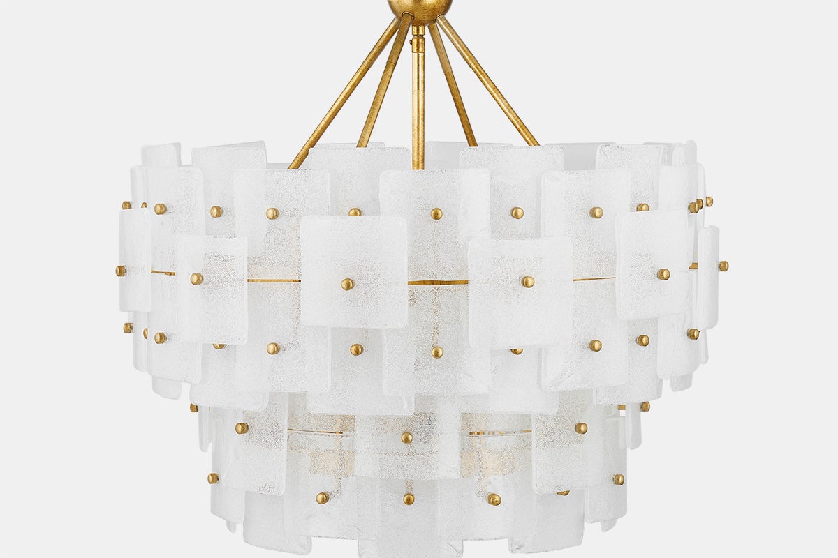 Translucent square glass forms wrapped in layers around the cascading drum silhouette of Jacik, creating an eye-catching statement. Crafted from Candy Glass, each piece is defined by a delicate bubble texture that adds to the artistry and depth of this chandelier. To complement the artistry, Jacik is finished in Vintage Gold Leaf with graceful pins supporting each glass piece like jewelry.