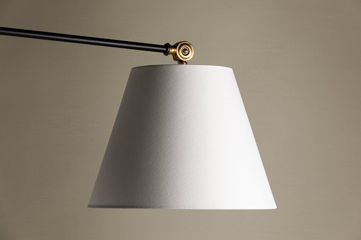 Navin's slender Textured Black arms and tapered white-linen drum shades get an industrial-inspired upgrade with mechanical parts in Patina Brass. Both the arm and shade angles of the floor lamp, chandelier, and sconce are fully adjustable to provide customized lighting for any space.