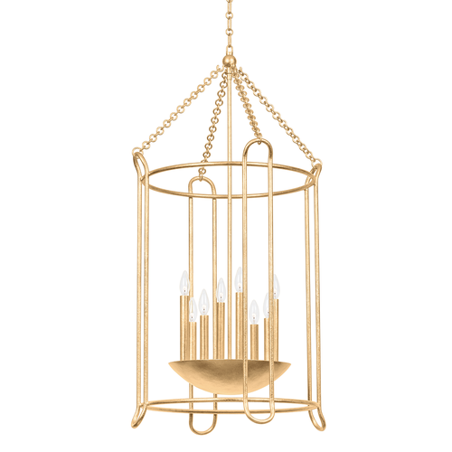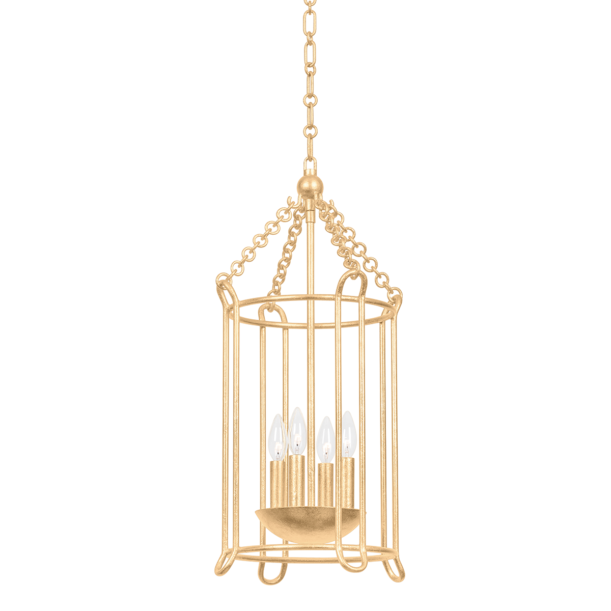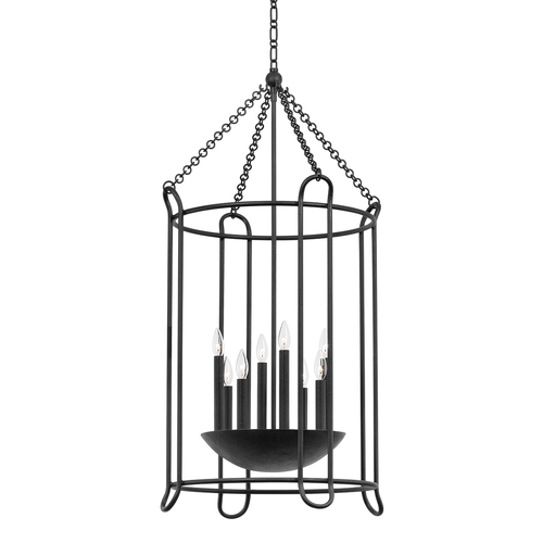 Streamlined, oval-shaped arms and a jewelry-inspired interlocking chain form Lassen's airy, sophisticated cage silhouette. Four, six or eight candlesticks rest elegantly in a unique bowl-shaped holder at the center, providing uplight from within. Choose from three sizes in a Black Iron or Vintage Gold Leaf finish.