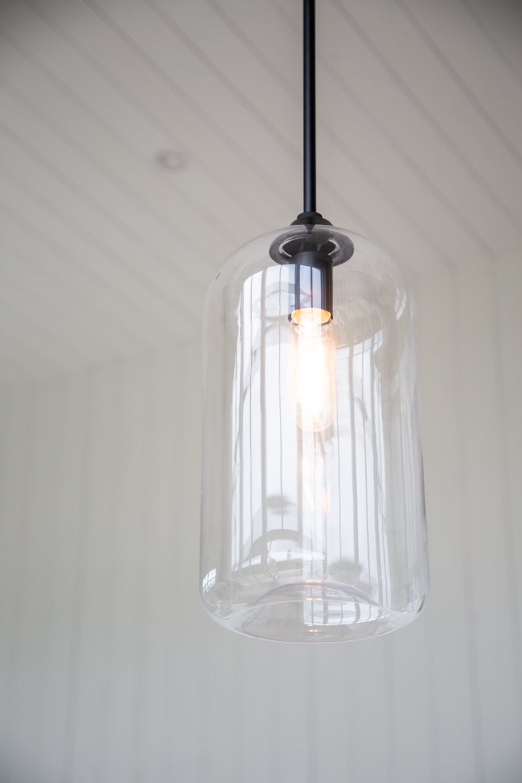Offering a vintage twist to classic industrial style, District features a smooth hand blown glass shade in three colors; Clear, Topaz, and Smoke, and two sizes. A closed concave detail at the base of the cylindrical shade catches and reflects the light source above for a subtle ambient glow.