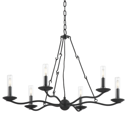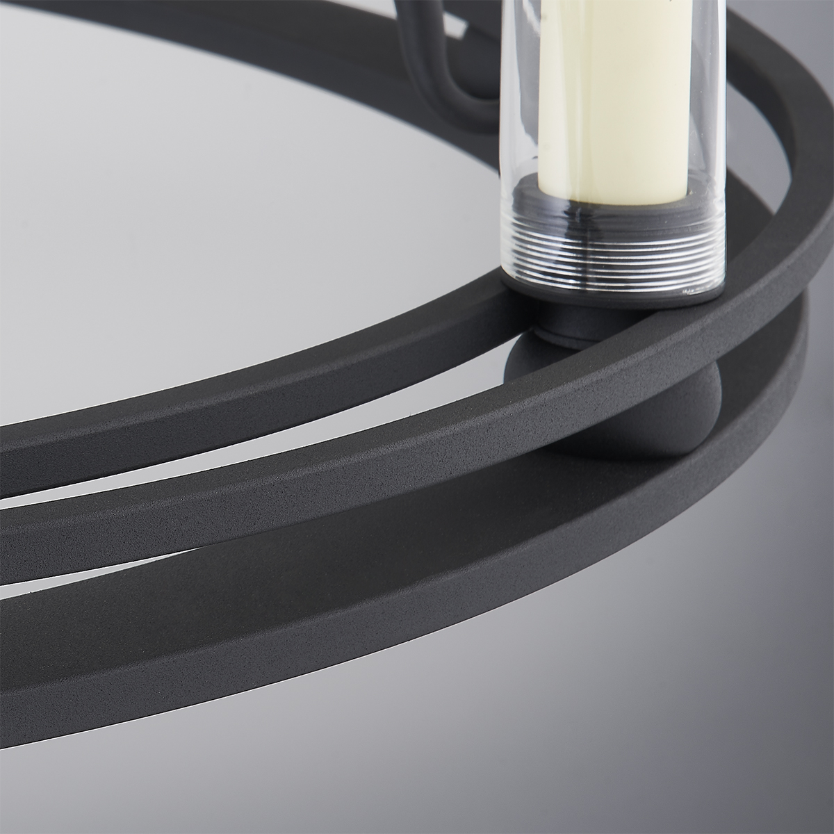 A pair of rings form the circular silhouette of this stunning chandelier. Candlesticks around the circumference provide an abundance of bright, beautiful light. Also available as a wall sconce in Textured Black. The chandelier is available as a single or double tier in Champagne Silver Leaf or Textured Black. SKU F6233-TBK is exterior or interior, the rest of the family is interior only.