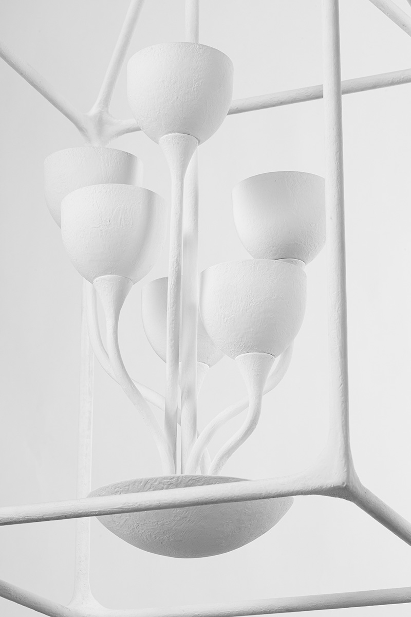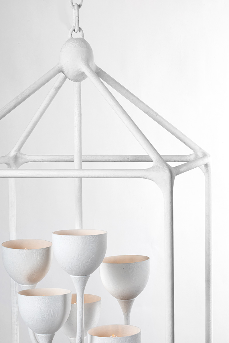 A centerpiece of curved arms and goblet-inspired shades suspends within a smooth, open framework, giving a new look to the traditional lantern-style pendant. The five-, eight- or twelve-light options all provide beautiful uplight, illuminating the fixture from within. Finishes in textured, hand-crafted Vintage Gold Leaf or Gesso White add a glamorous look with a natural feel.