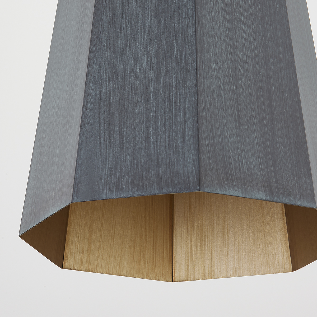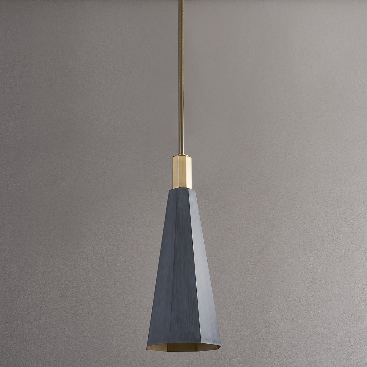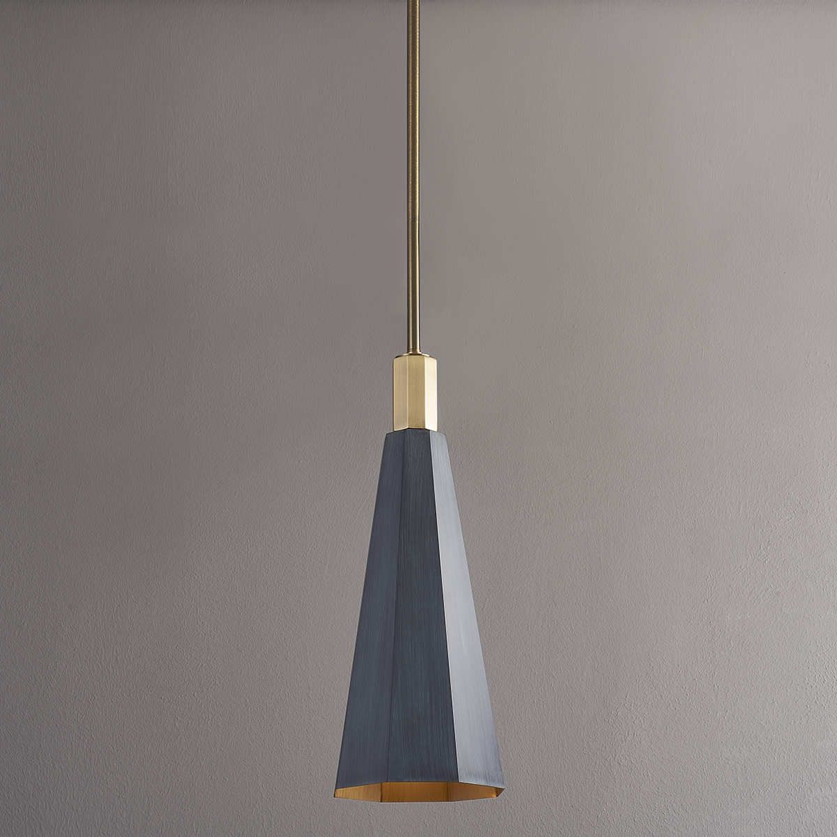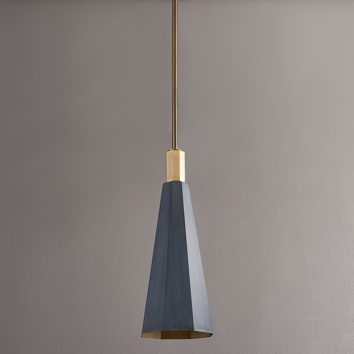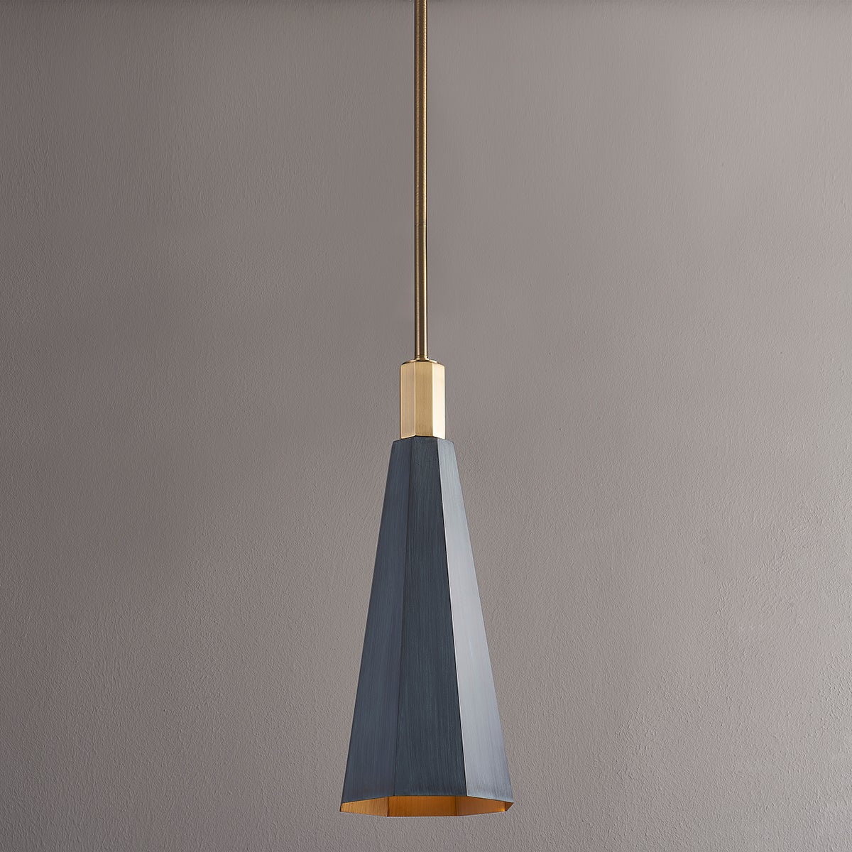 A modern update on the traditional cone-form pendant, this elevated design features a faceted shade with a unique brushed matte Verde finish or a fresh Soft White finish. The Patina Brass lining gives off a beautiful warm glow.