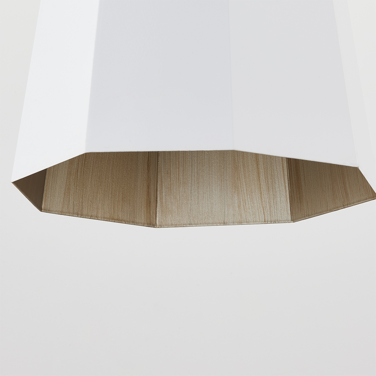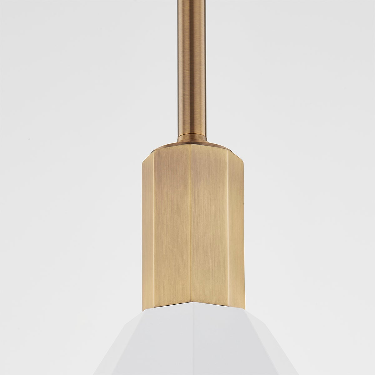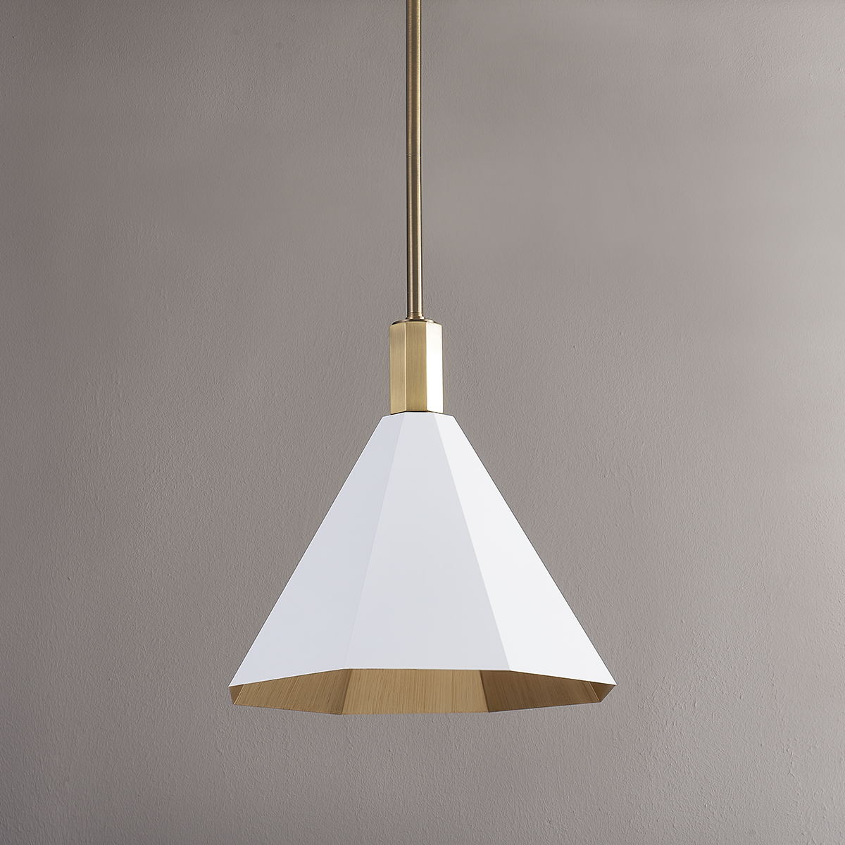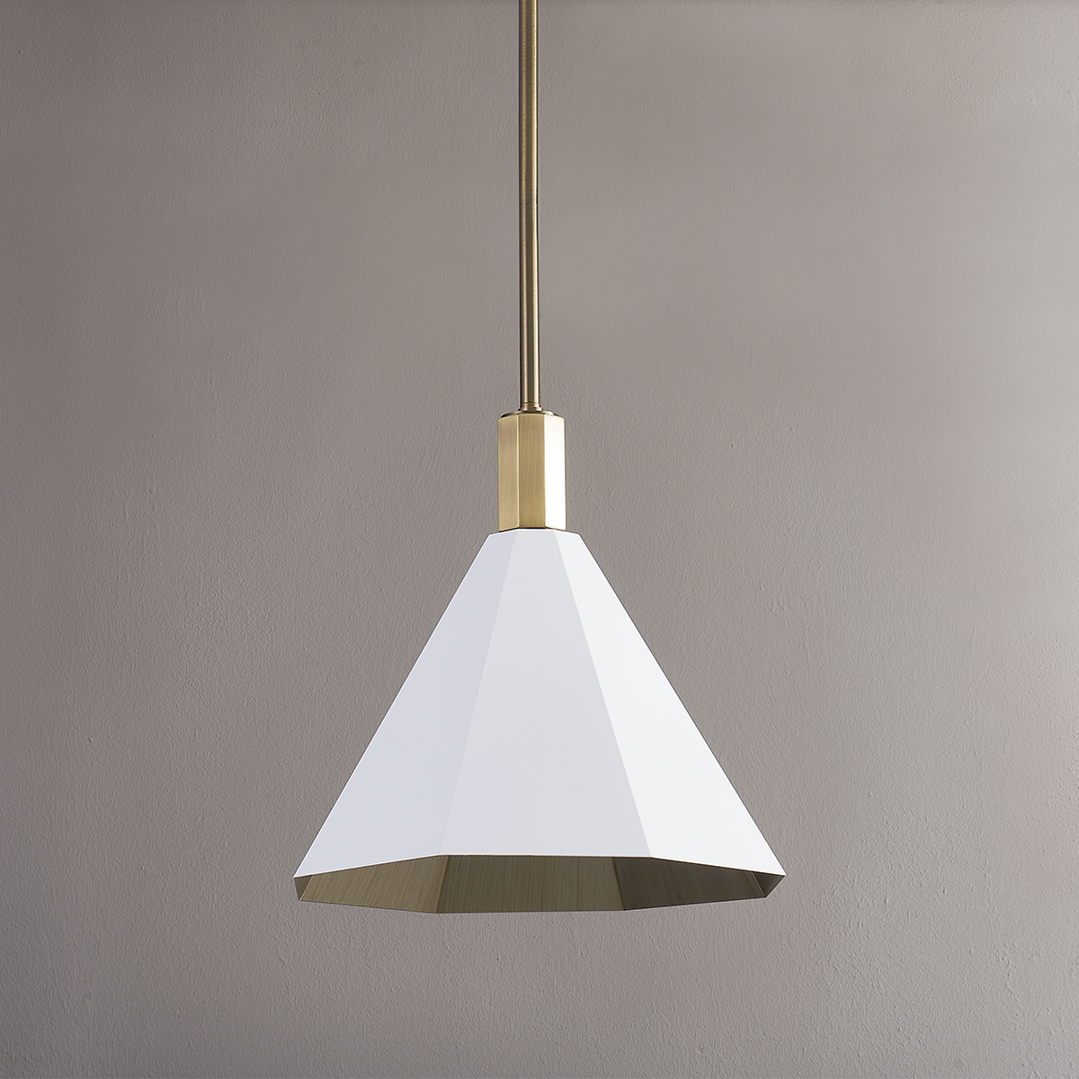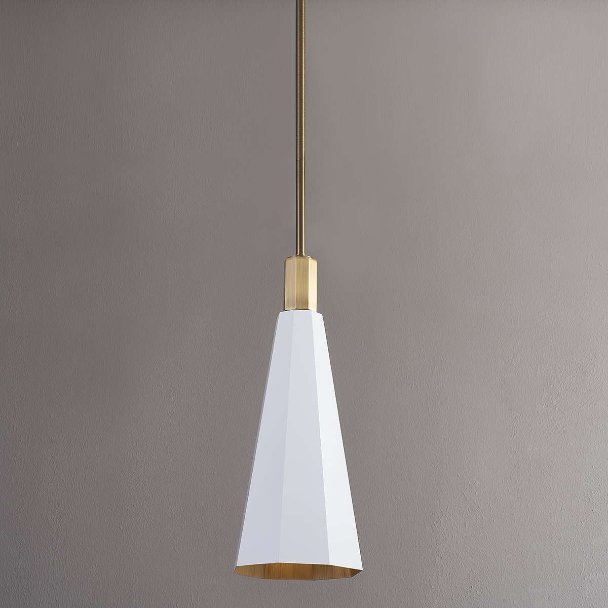 A modern update on the traditional cone-form pendant, this elevated design features a faceted shade with a unique brushed matte Verde finish or a fresh Soft White finish. The Patina Brass lining gives off a beautiful warm glow.