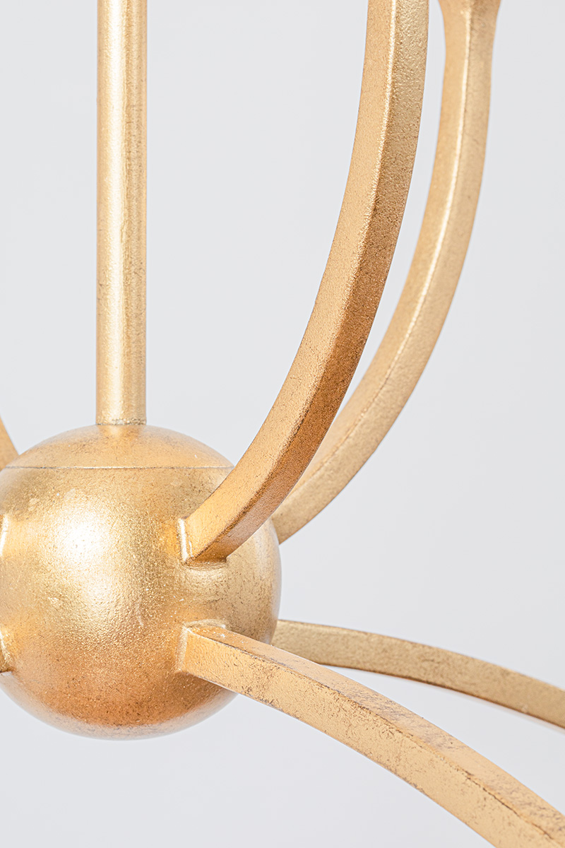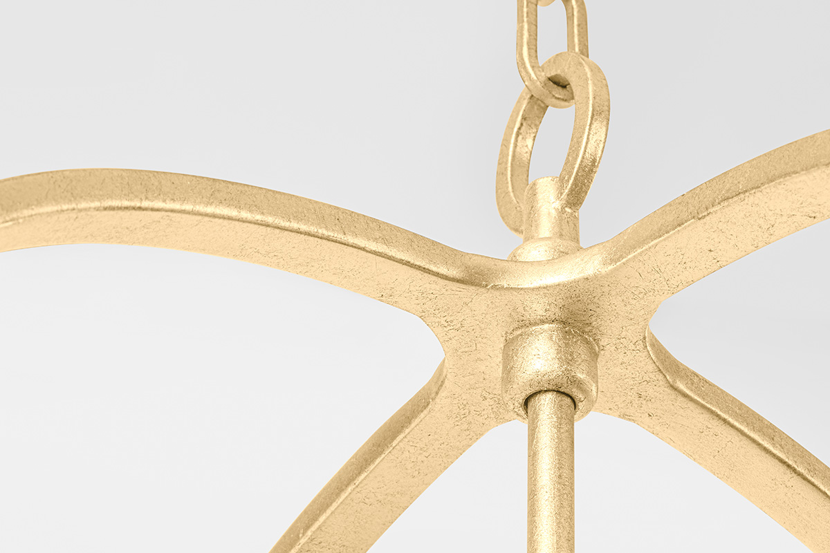 An open, airy curved cage holds four candelabra bulbs flowing from a center orb creating a soothing, sophisticated silhouette. The cage features smooth accent shapes and flowing teardrops that accentuate the pendant's slim profile and graceful look. Go for a cooler look in Black Iron or add warmth with the Vintage Gold Leaf.