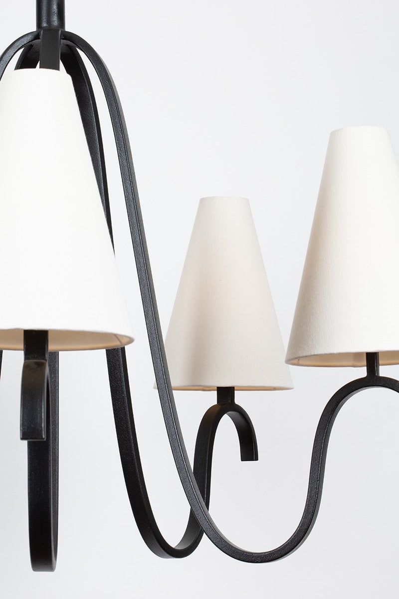 Traditional off-white linen shades contrast against soft, swooping Forged Iron metalwork to create the perfect transitional piece. Available as a one-light sconce and three- or five-light chandelier, Melor adds chic style to any interior.