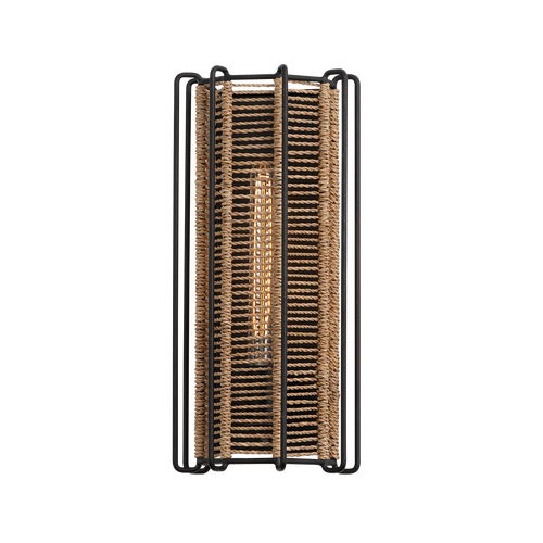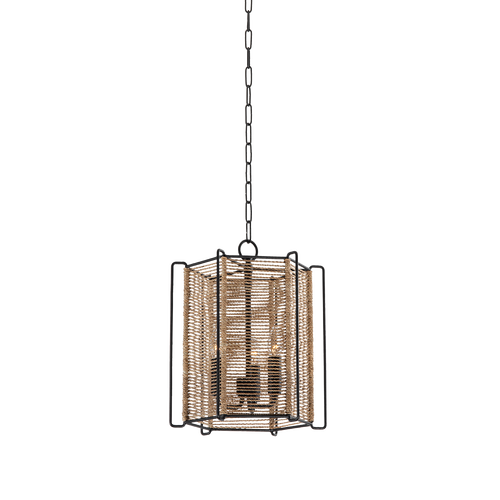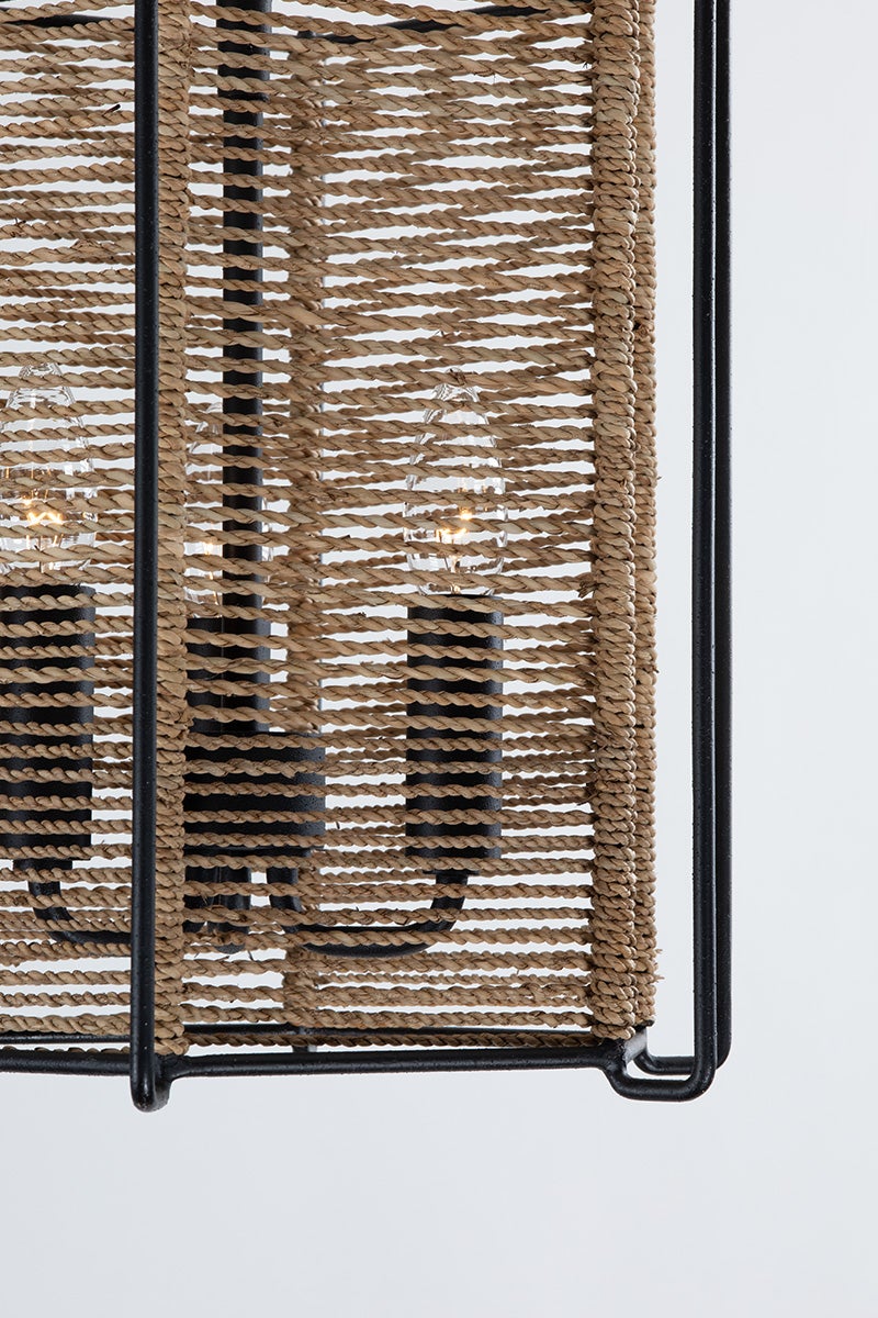 A textured black framework is wrapped in natural jute on the interior to create a modern industrial style that looks rustic yet elevated. The metal frame is vertical and the rope detail runs horizontal forming a dynamic silhouette that feels fresh. The lantern is available in three different sizes to suit any space.