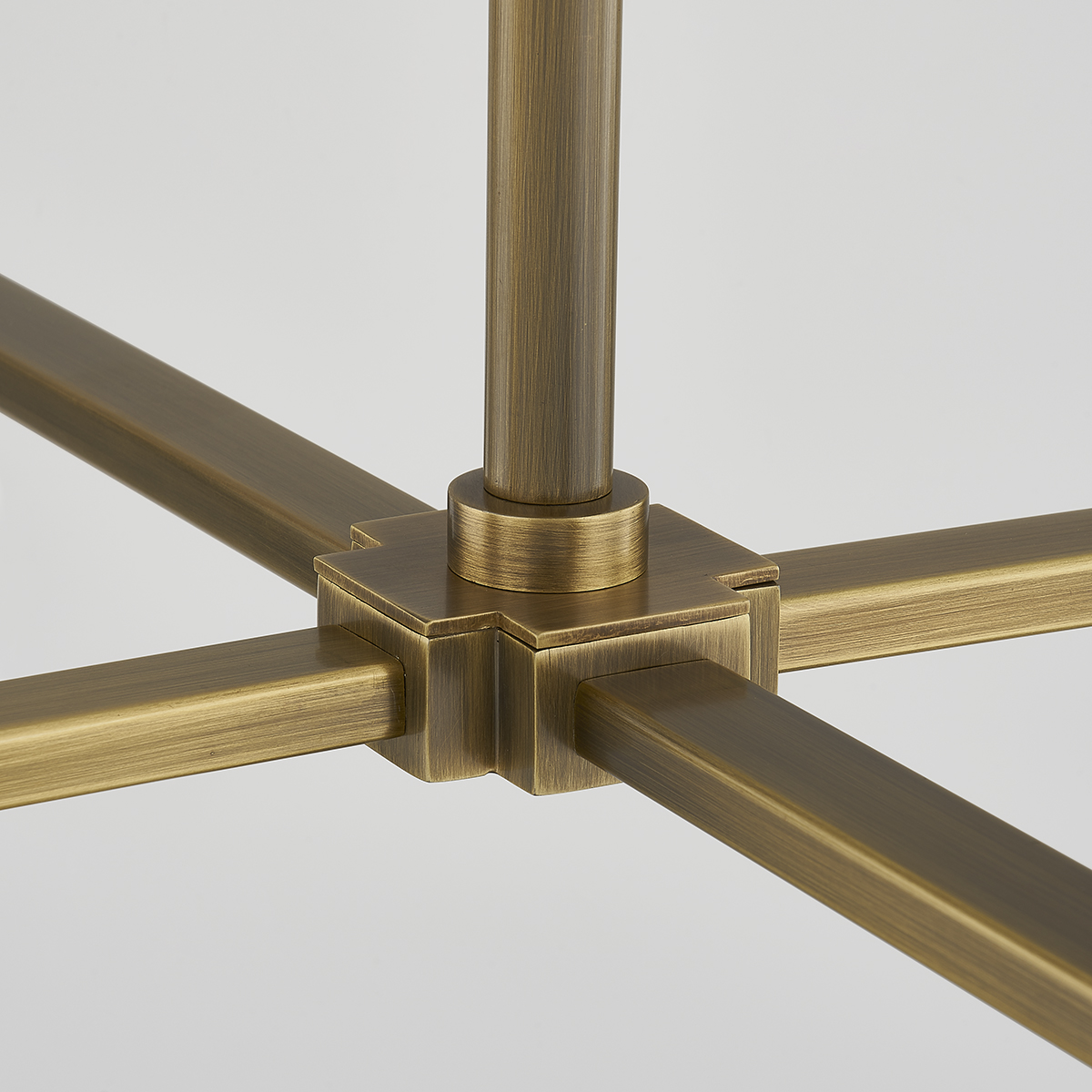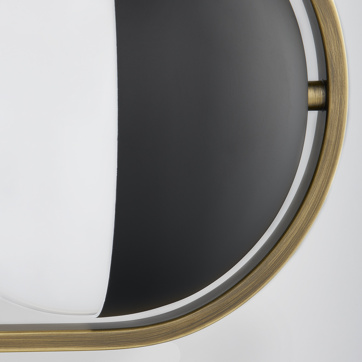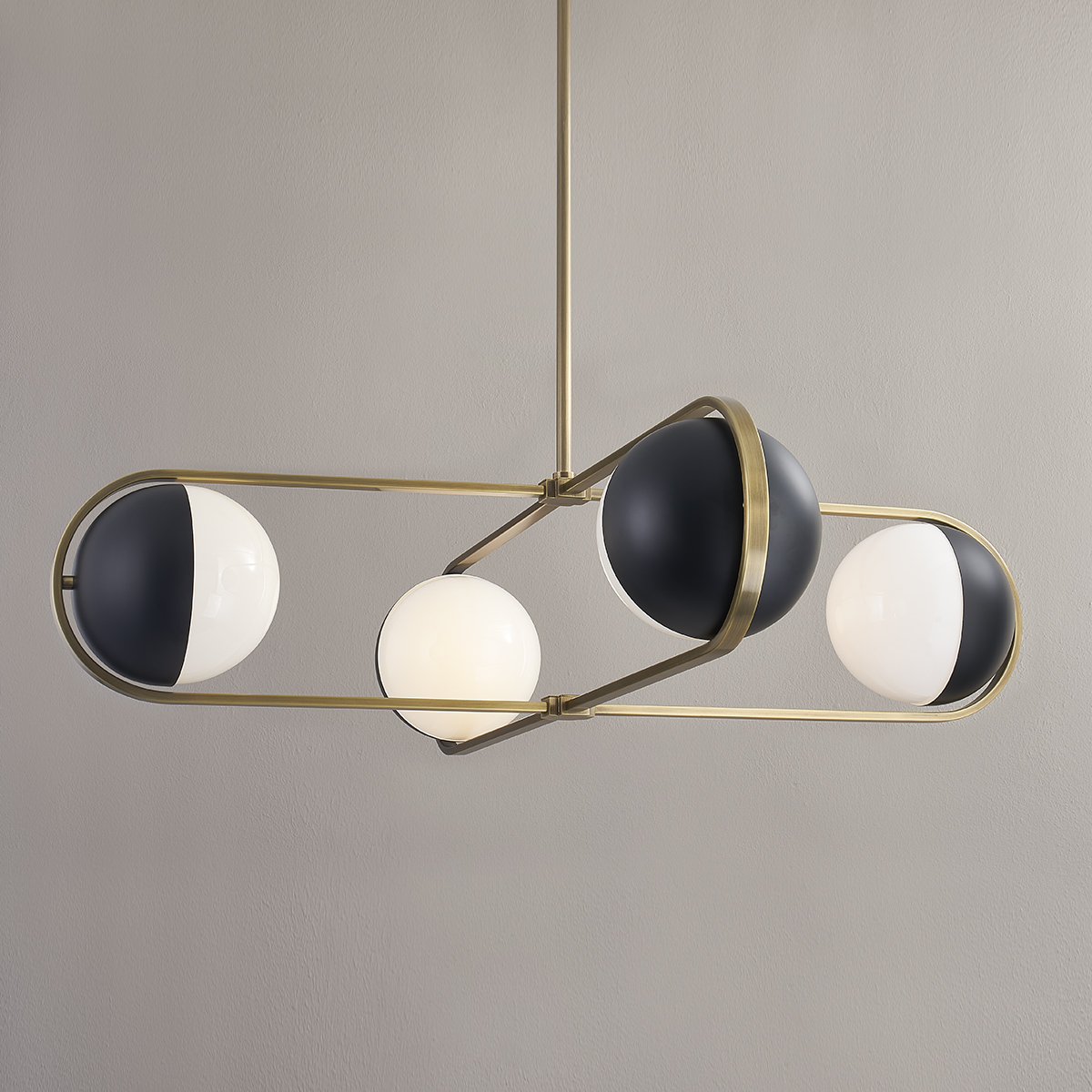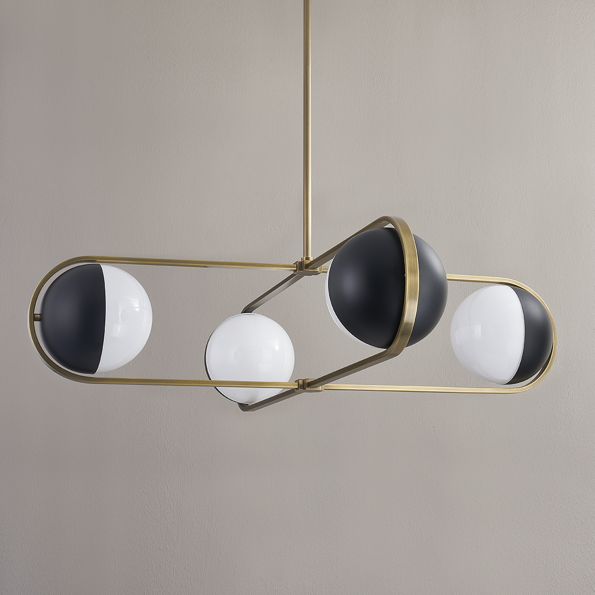 Capped opal glossy globes are suspended within elongated metallic bands for a look that is balanced and beautiful. The Patina Brass and Soft Black finishes work together to give the fixture an earthy, moody vibe. The clean lines and unique design bring a glamorous modern styling to any ceiling.