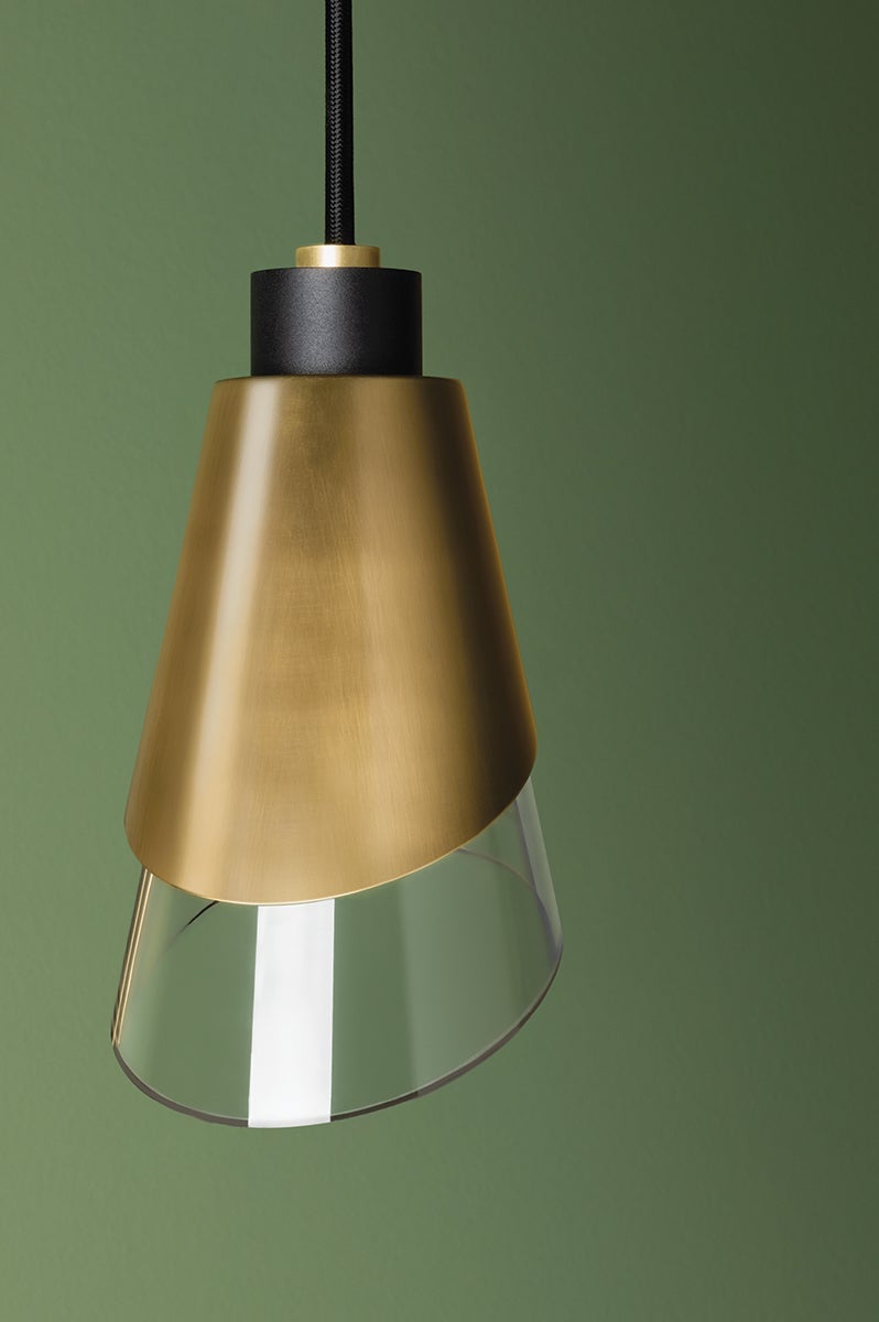 Inspired by the runway, Angie features a metal-wrapped asymmetrical glass shade with a cinched waist for dramatic effect. Available in different styles and finishes, Angie can go from soft and warm in aged brass or cool and captivating in polished nickel. Talk about a style chameleon!