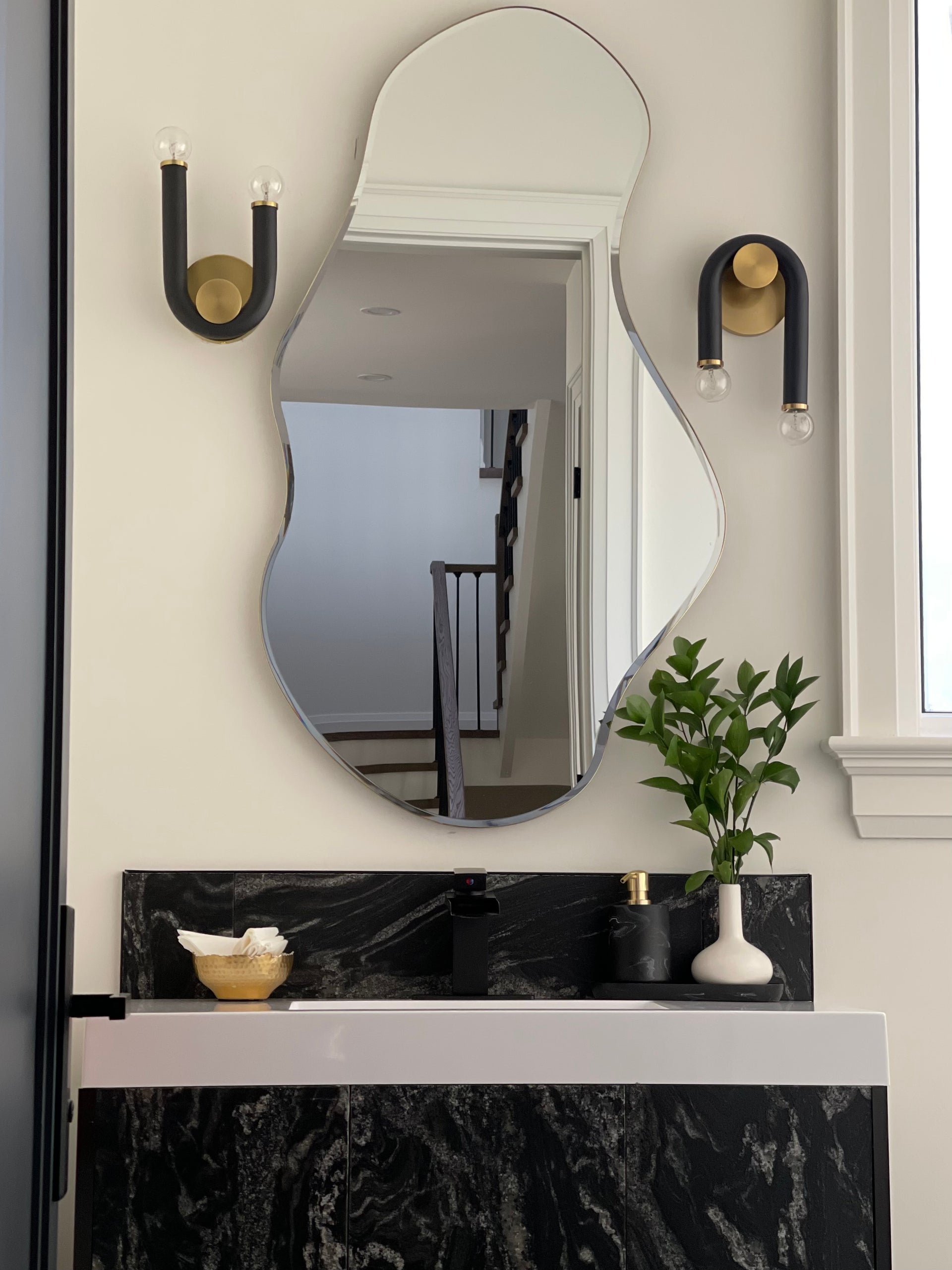 Whimsical for the win. A playful take on modern design, Whit features a sweeping black metal tube draped over aged brass or polished nickel accents. The uneven lines create visual interest and allow light to shine at slightly different heights. Choose from a pendant, chandelier, linear, floor lamp or wall sconce that can be mounted to provide either uplight or downlight.