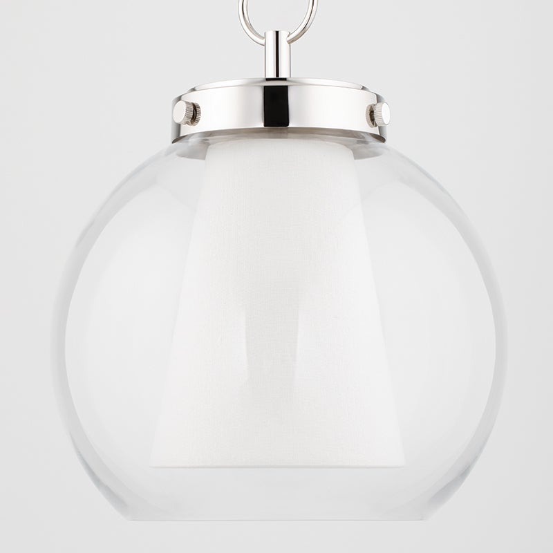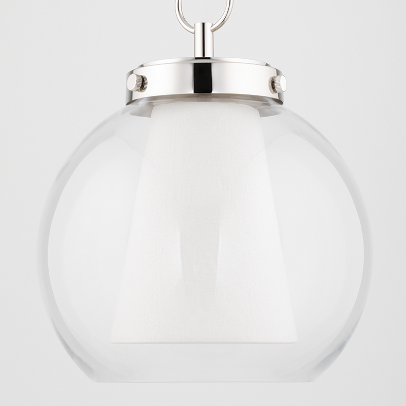 A chain cord, metal finish canopy and unique shade-within-a-shade design make this Sasha totally fierce. A white, Belgian-linen, cone-shaped shade is covered by a clear glass globe shade to emit a soft glow that shines bright. With two pendant sizes in three finishes (Aged Brass, Old Bronze and Polished Nickel) there's something for every space and taste.