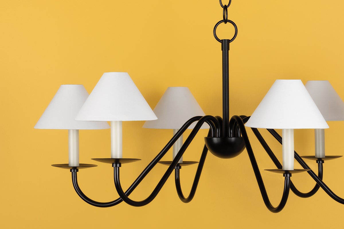 Inspired by colonial revival design, Lenore fancies herself a history buff, drawing from the past to inform her classic silhouette. Sweeping, elegant arms extend to candlestick fixtures, topped with tapered linen shades. Choose soft black for a more contemporary take or aged brass for something more precious. Equal parts formal and flouncy, Lenore's chandelier style is understatedly whimsical—perfect for dinner party guests to admire.