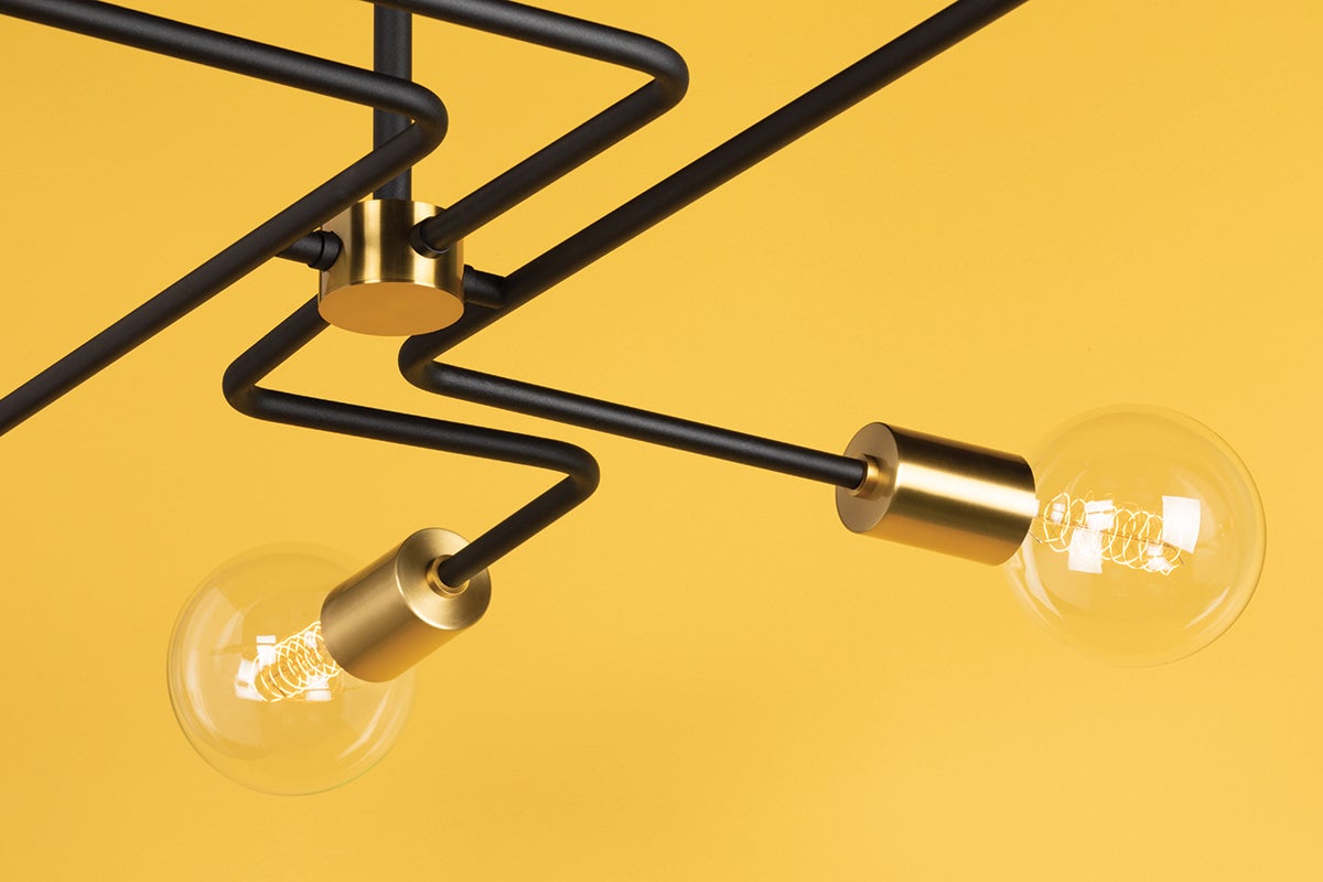 Jena sprawls like a circuit grid, creating an industrial web of intricately laid metalwork up above. Not for the faint of heart, Jena brings high design wherever she goes. Armed with six globe lights, Jena can brighten a bedroom, office, or playroom. Available in two sizes and finishes: aged brass or polished nickel.