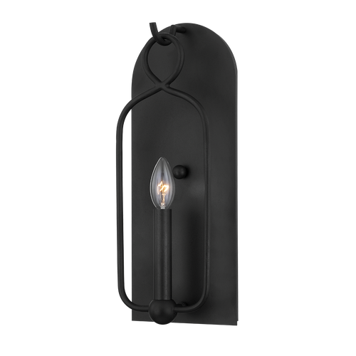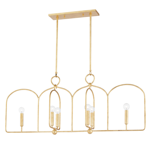 With its open, arched metal frame and gold leaf or aged iron finish, Mallory makes a stylish statement. Clear, round bulbs atop sleek, straight candle holders create a beautiful contrasting effect. Available as a sconce, pendant or linear, each fixture hangs from a round metal loop giving the piece a feeling of motion.