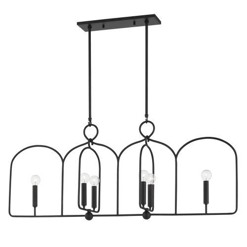 With its open, arched metal frame and gold leaf or aged iron finish, Mallory makes a stylish statement. Clear, round bulbs atop sleek, straight candle holders create a beautiful contrasting effect. Available as a sconce, pendant or linear, each fixture hangs from a round metal loop giving the piece a feeling of motion.