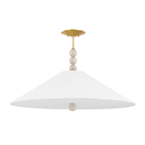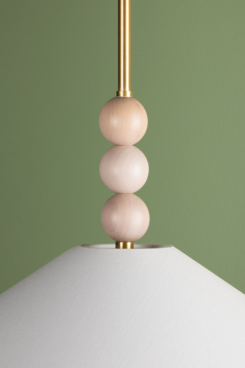 Alexis reimagines a traditional American design detail. Inspired by vintage bobbin furniture pieces, wooden spheres of whitewash ash decorate a white linen shade from both above and below, creating the illusion that they pierce through the shade. Natural elements and a simple silhouette make this pretty pendant a welcome addition to any space.