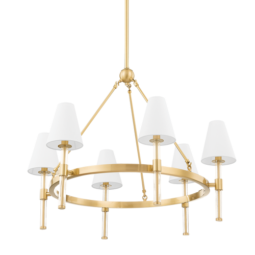 A beautiful blend of acrylic, metal and linen, Janelle gives off a vintage vibe with details that feel fresh. Tapered white linen shades are suspended on long, linear sticks of acrylic that allow the metal details inside to show through. With linear, chandelier and sconce options in aged brass or polished nickel, this updated retro design is sure to find a place in your space.