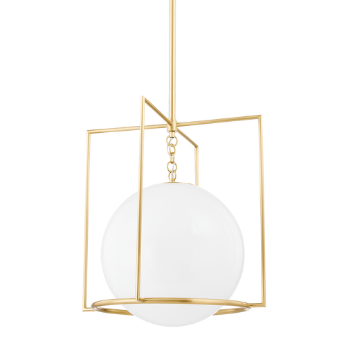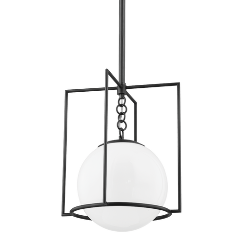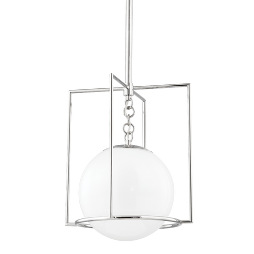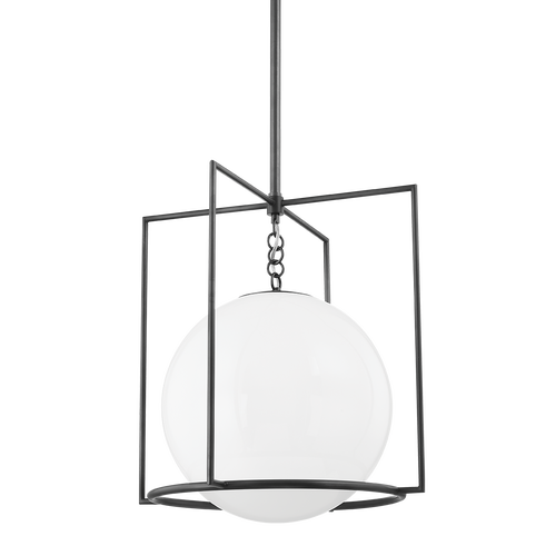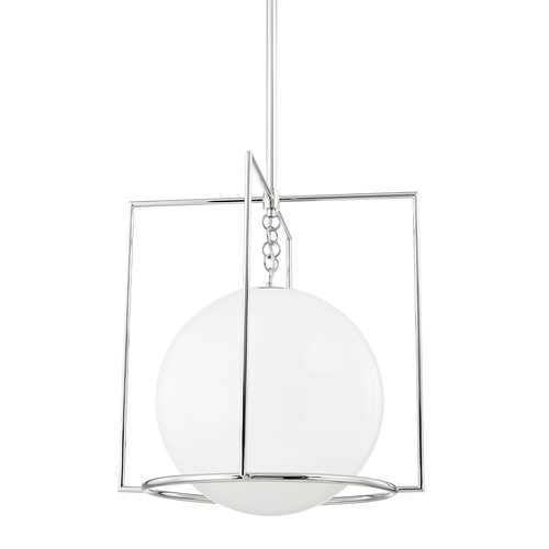 A study in contrasts, Frankie plays with positive and negative space and geometry. A large opal shiny globe hangs within a square cage of aged brass, old bronze or polished nickel. The fixture is perfectly balanced, yet fascinating to look at—the globe appears to float above the ring at the bottom. Frankie is sure to draw the eye and make a statement.