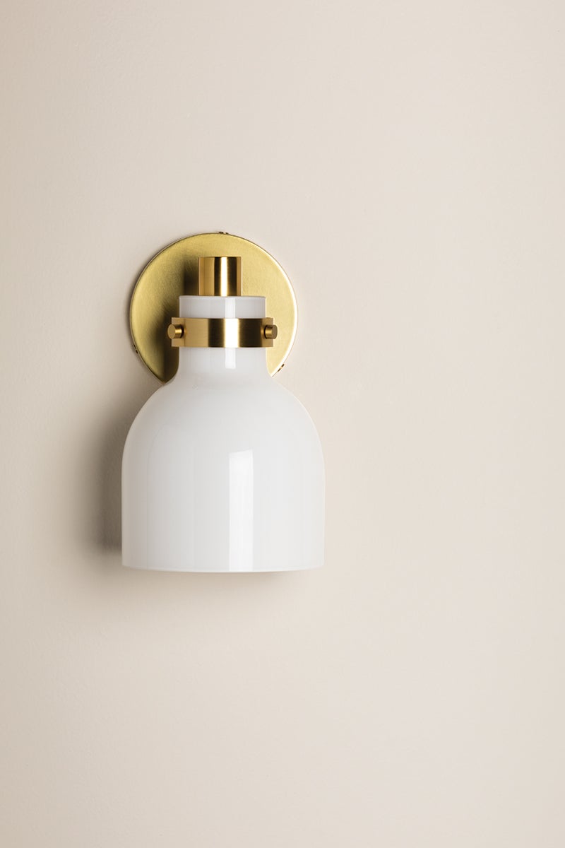 Bell-shaped shades in opal shiny glass add some shine while softening the light. Elli's hardware makes it easy to use and easy on the eye. Vintage-inspired glass fitters and thick cylindrical accents at the end of the arms take the fixture to the next level. Available in a one-, two-, or three-light option in aged brass or polished nickel