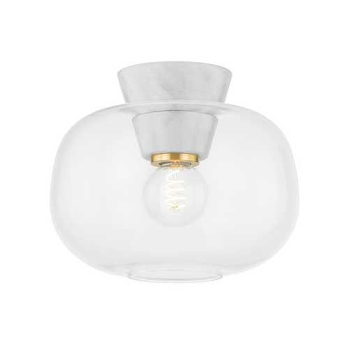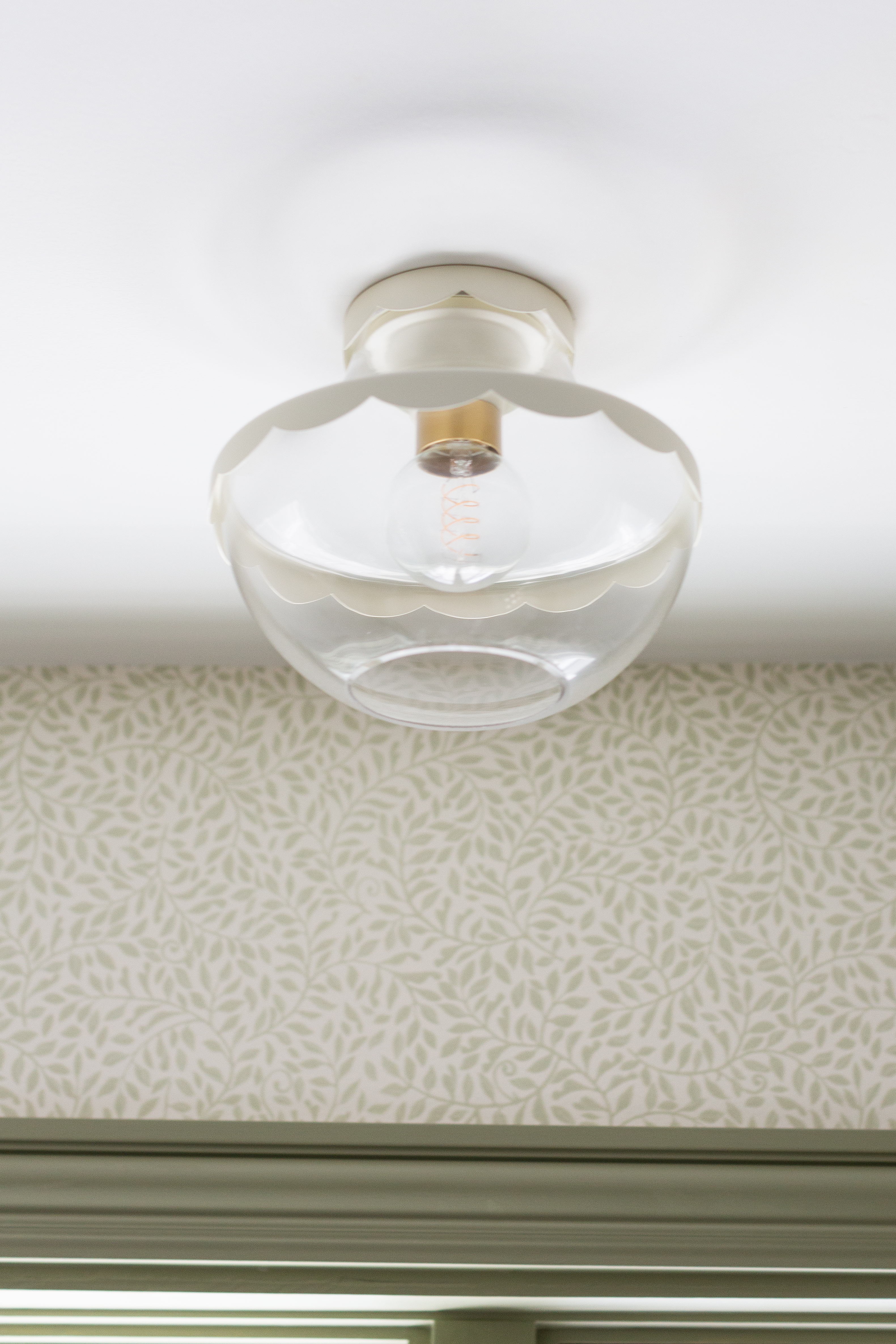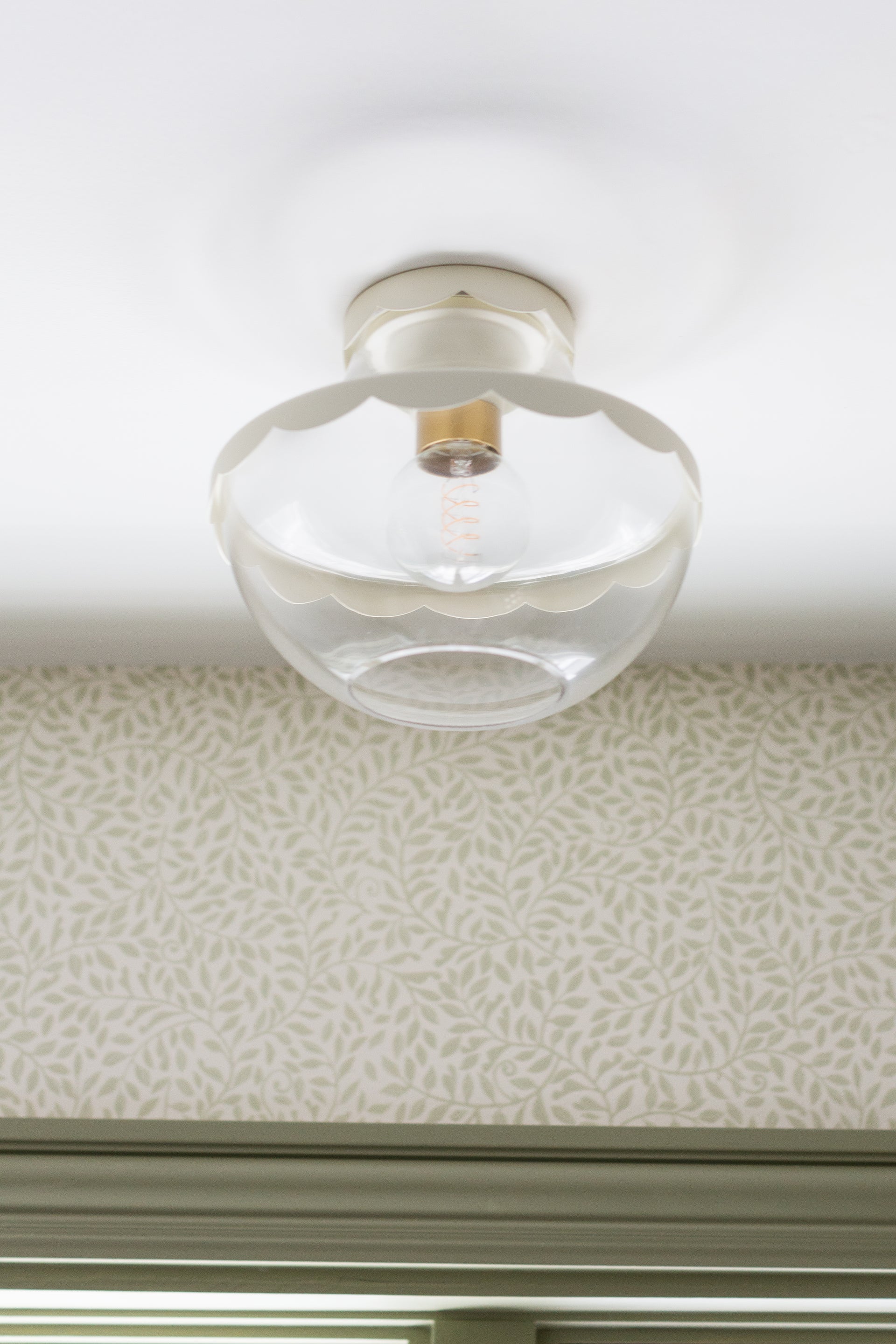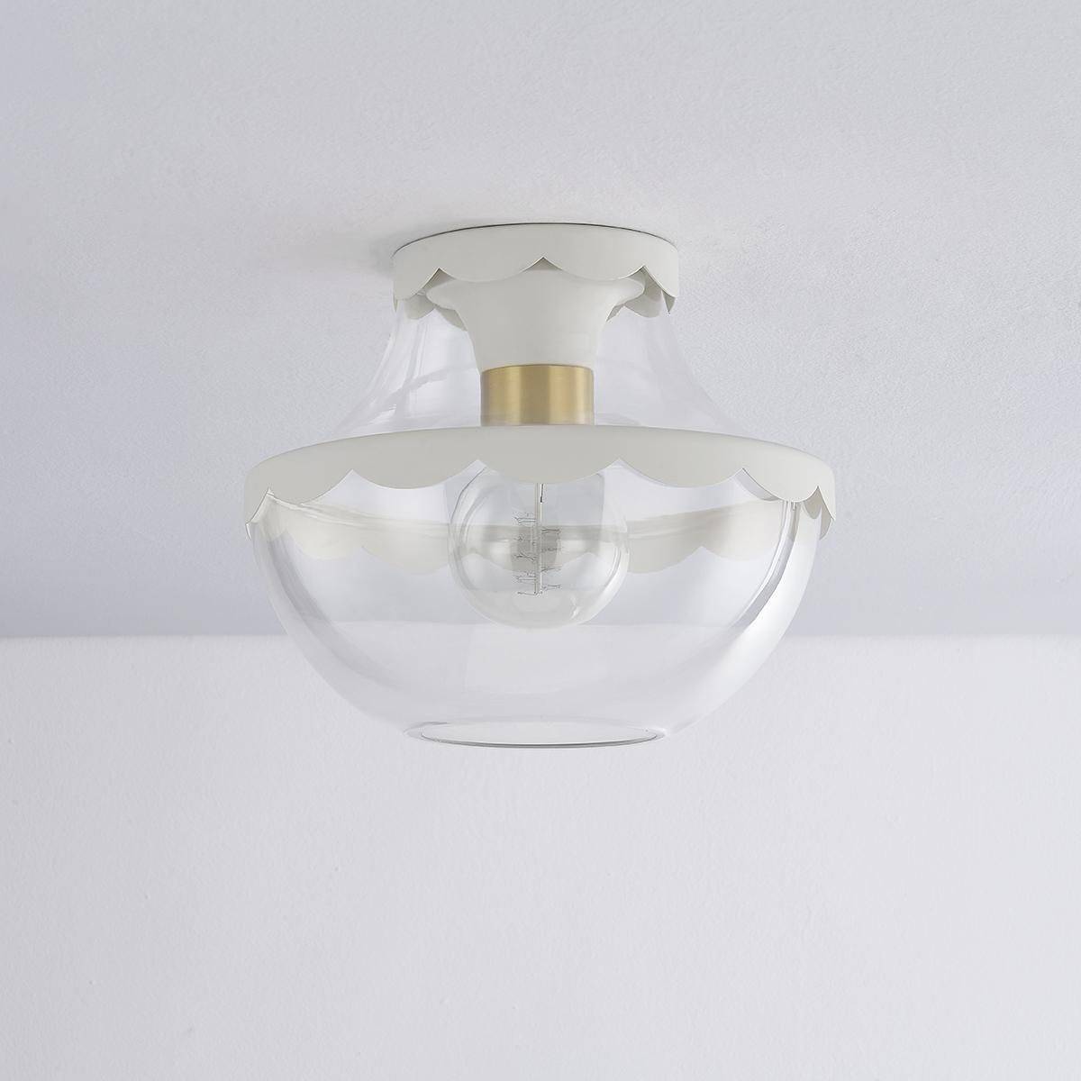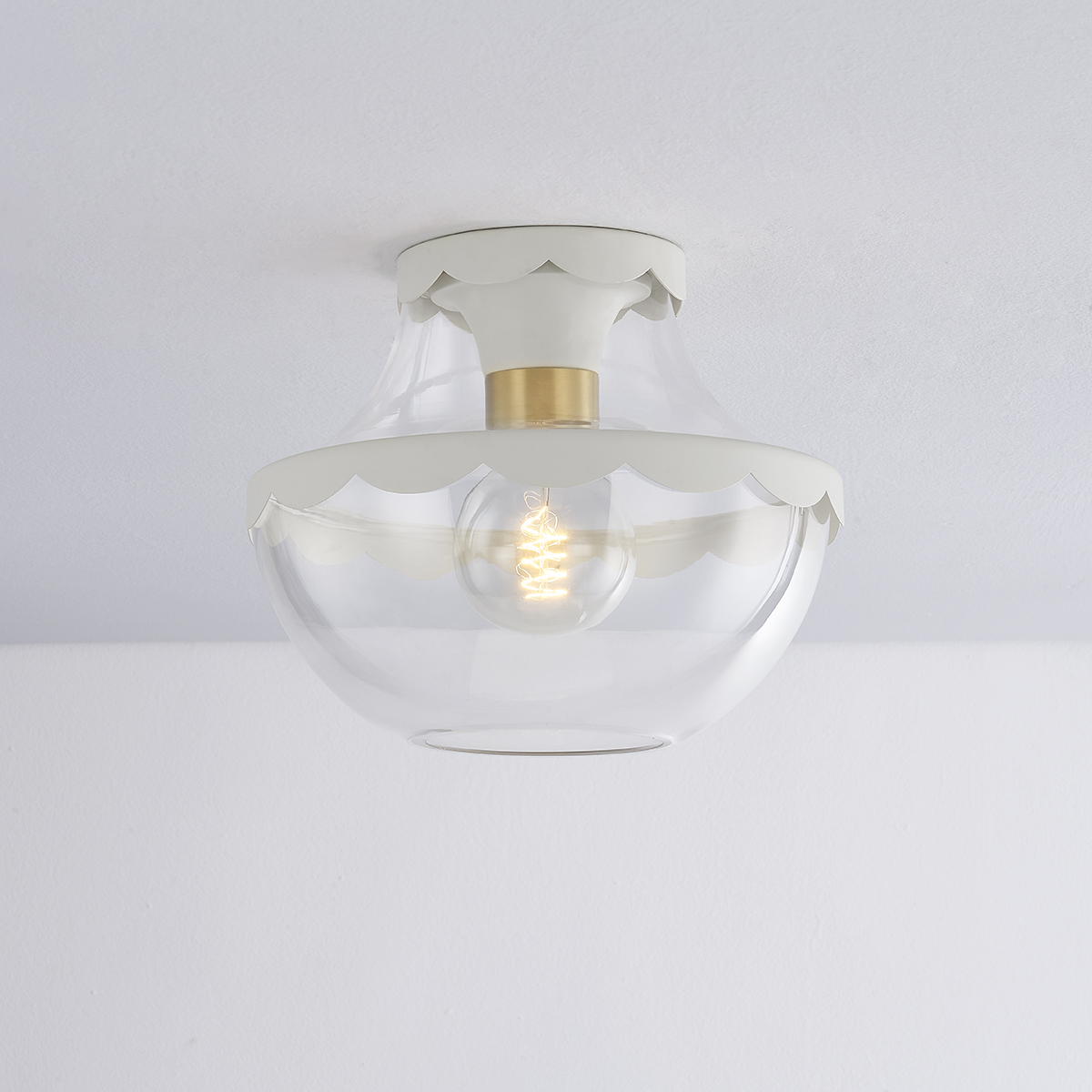 The Alaina is delightfully sweet, the bell-shaped silhouette is accented with soft cream scalloped trim. Aged brass details soften the look, adding a subtle sheen to the Pendant and Semi Flush. The Pendant is available in small and large.