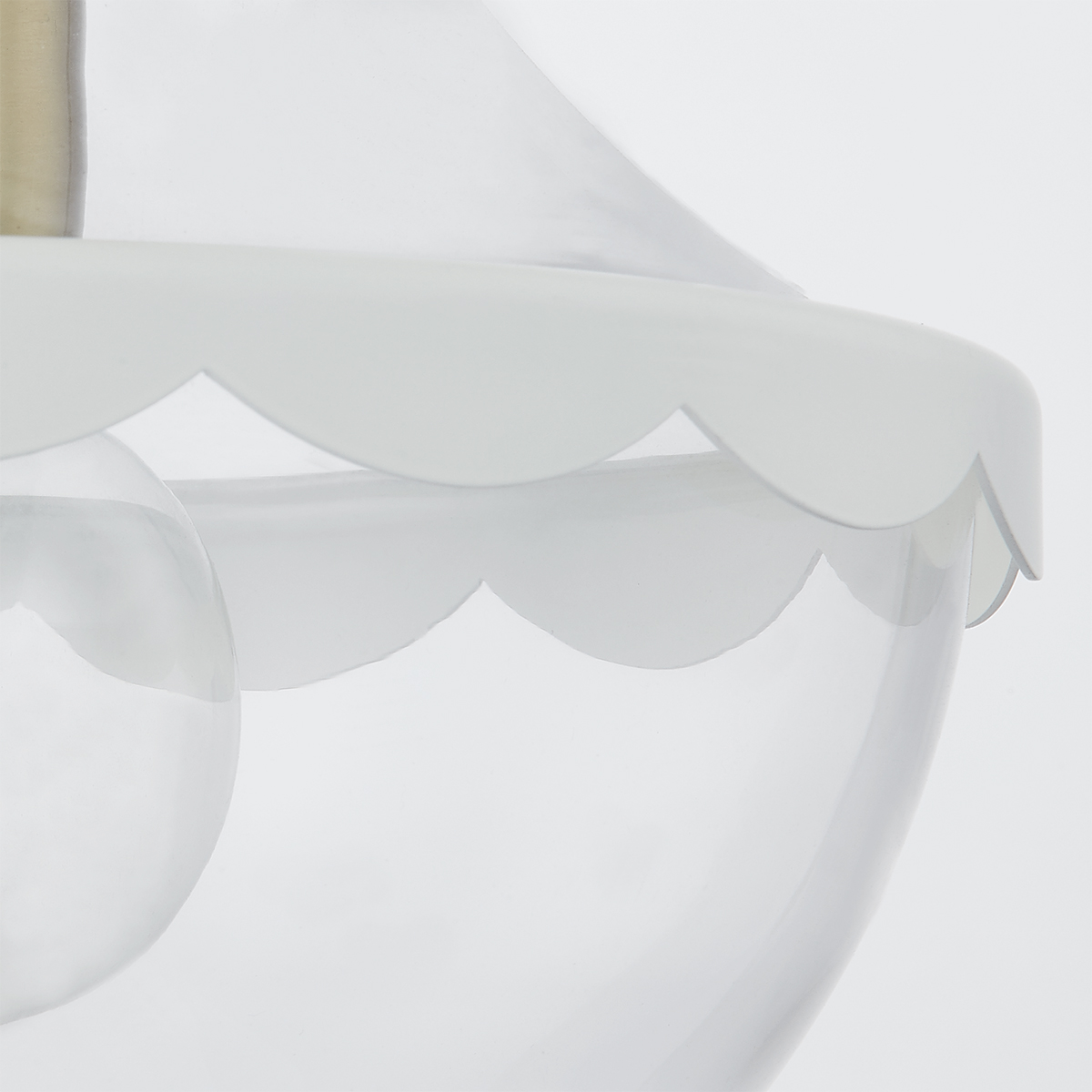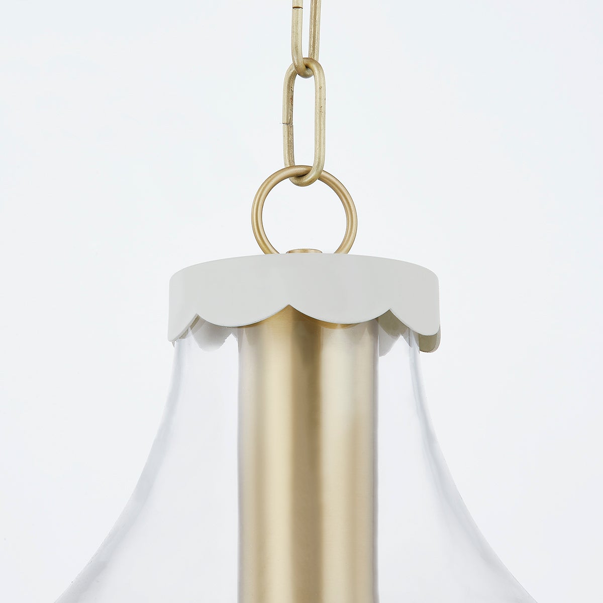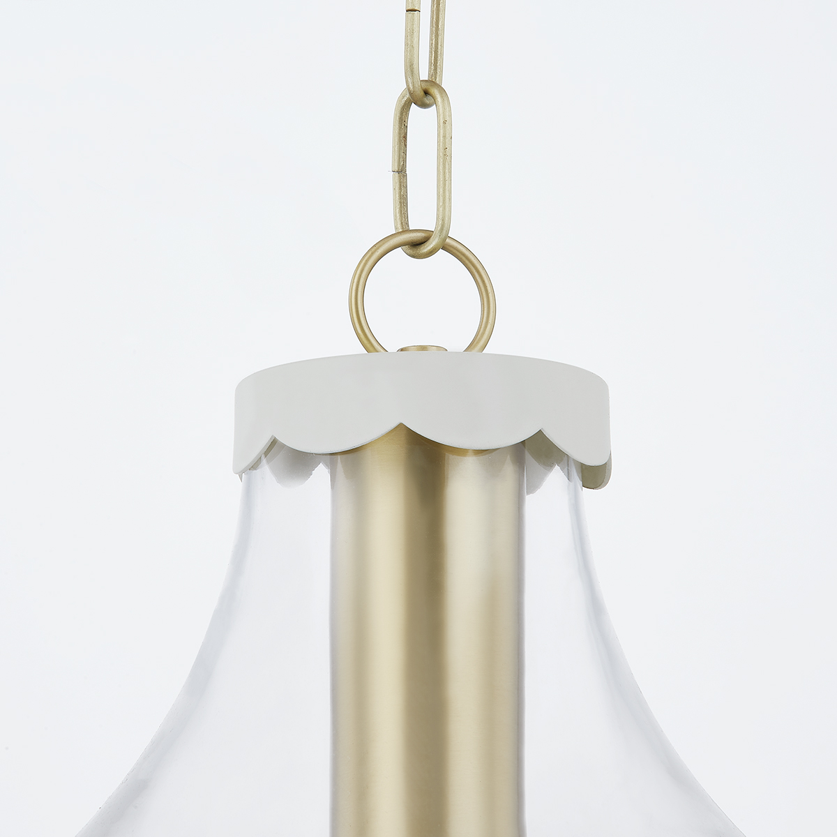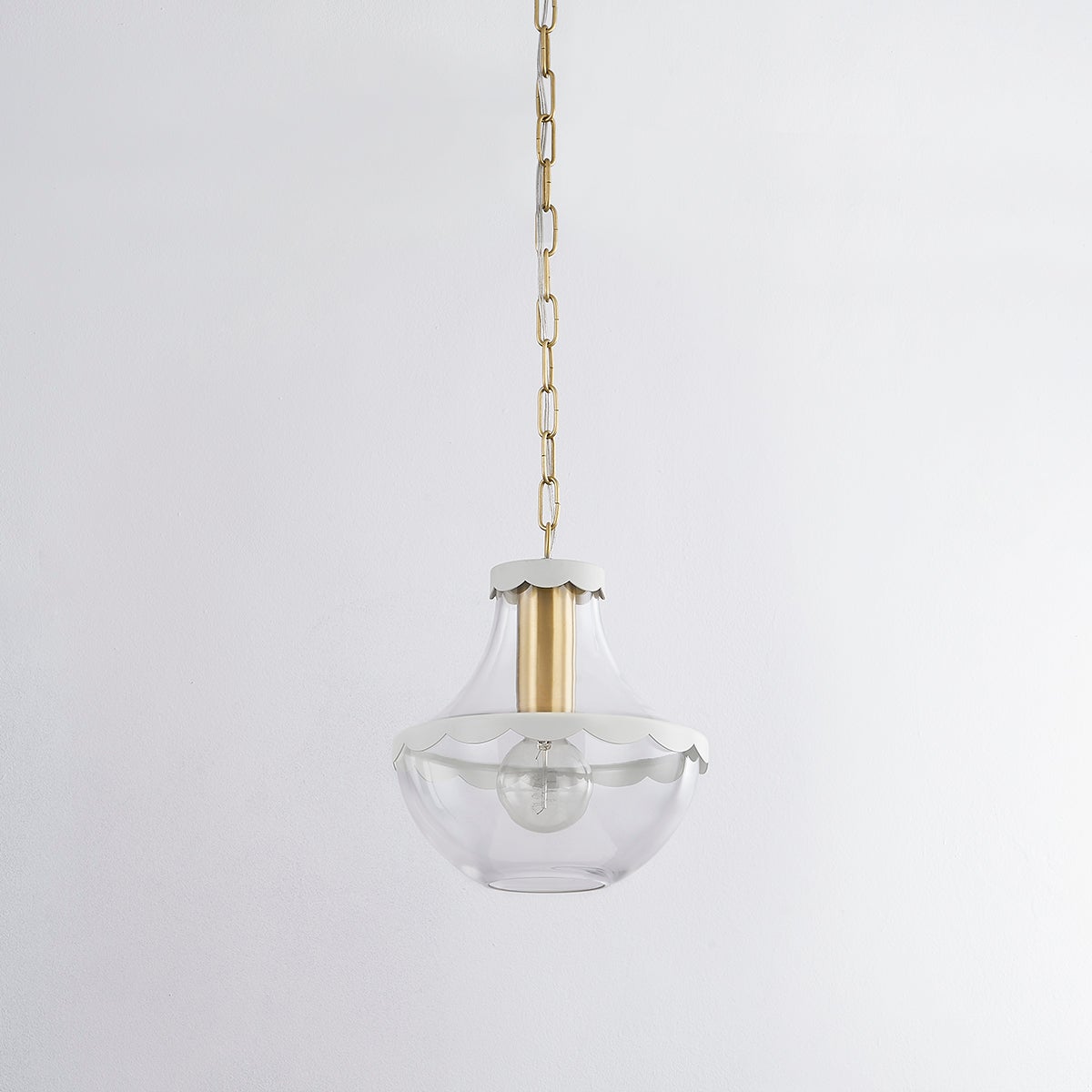 The Alaina is delightfully sweet, the bell-shaped silhouette is accented with soft cream scalloped trim. Aged brass details soften the look, adding a subtle sheen to the Pendant and Semi Flush. The Pendant is available in small and large.