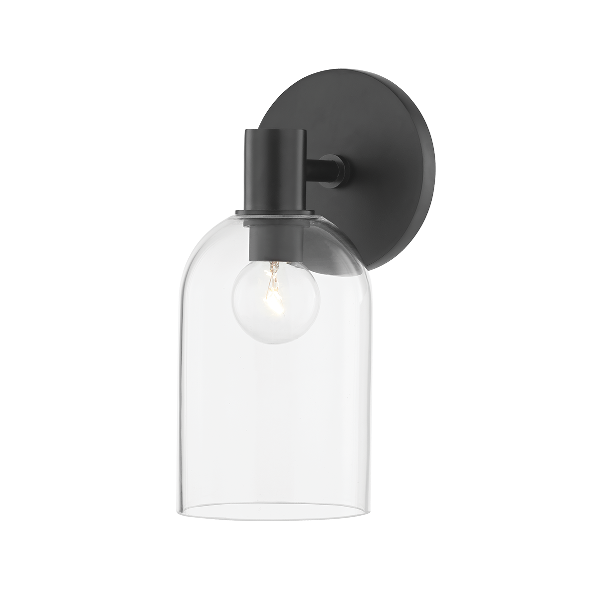 Drawing inspiration from antique glass bottles, a cloche-like shade in clear glass showcases a single bulb nested at the top of the glass. A simple metal arm, circular backplate and cylindrical holder add to Paisley's crisp, clean look. While the two- and three-light options are an obvious choice for the bath, the single-light sconce would also work well in a hallway or beside a fireplace or window.