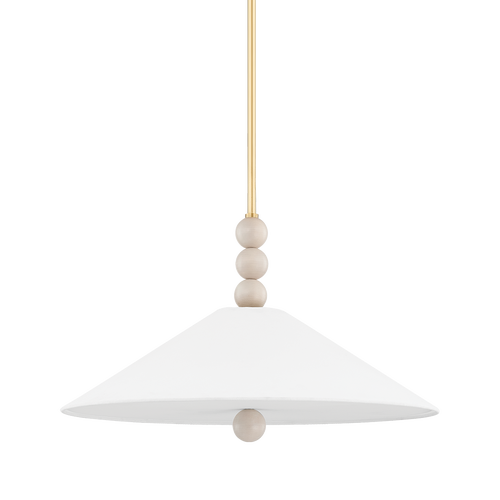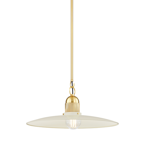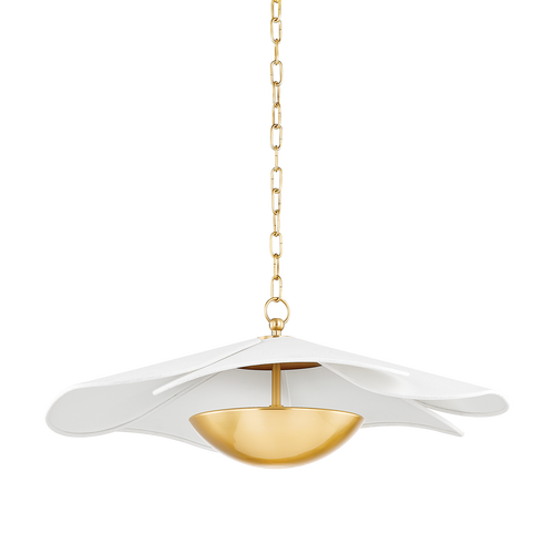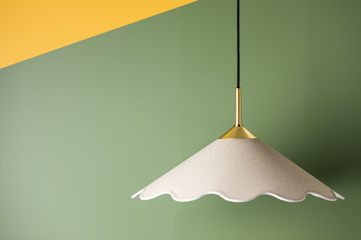Crisp, clean and effortlessly chic, Sodsai elevates the traditional pendant light. Pretty scalloped detailing on the natural linen shade soften the design. Just a hint of the clear glass bulb is visible from beneath the shade, sending a bright, clear light below while filling the shade above with a warm glow. The white shade, aged brass finish and black fabric-covered cord perfectly complement each other—and any color scheme.