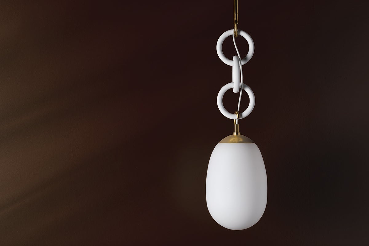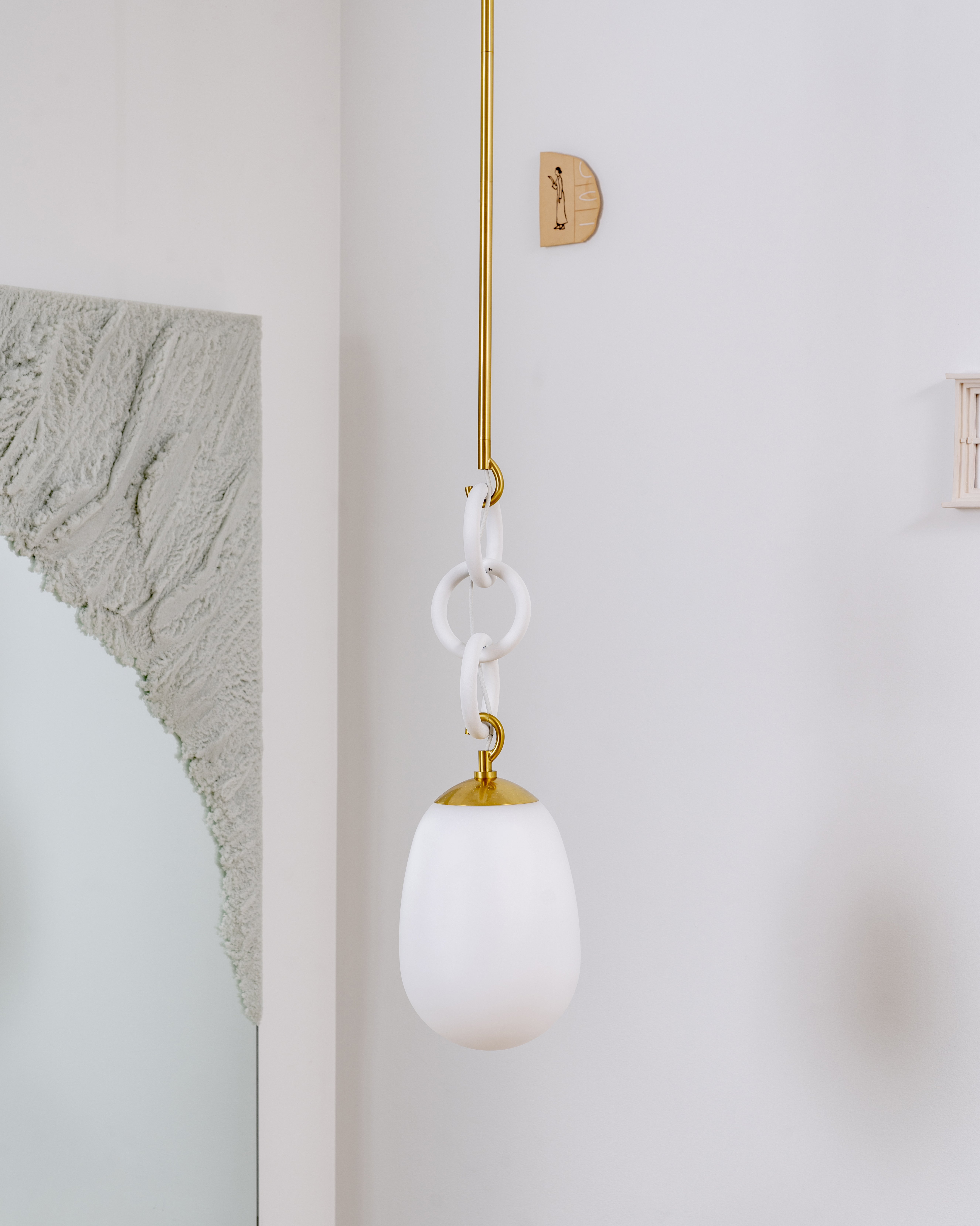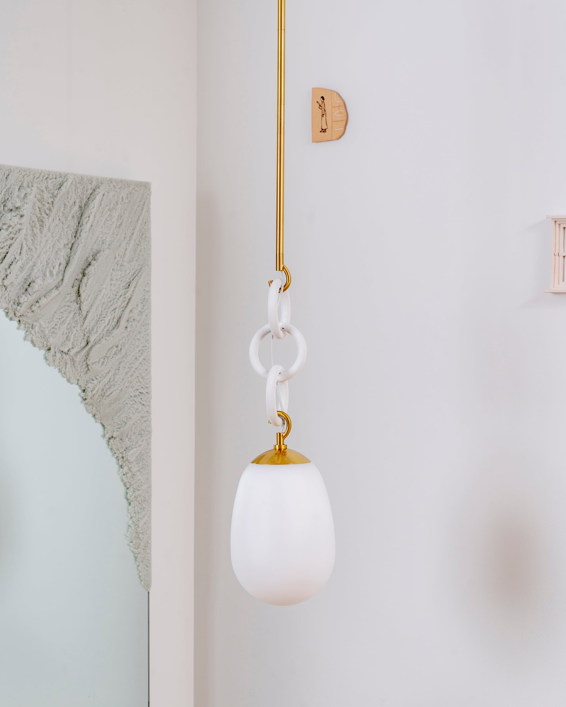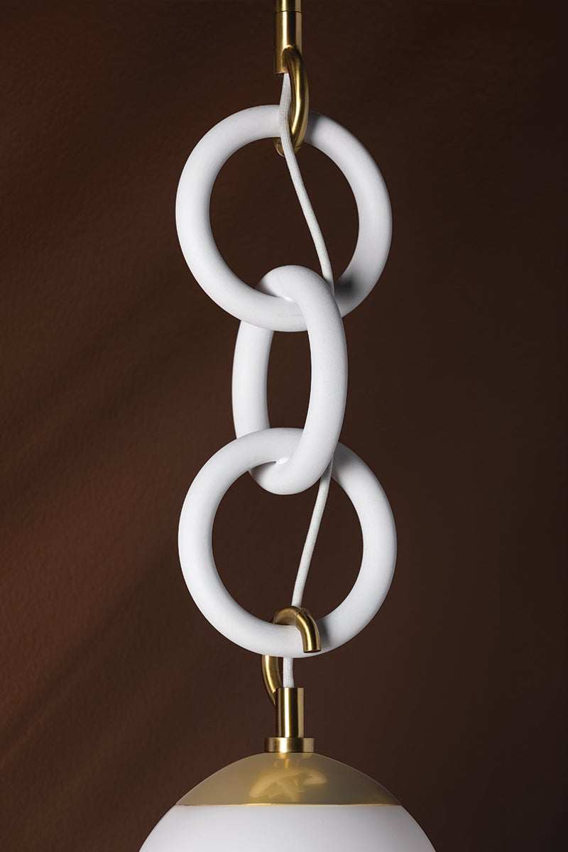 Chunky textured white rings give a handmade quality to this elegant design inspired by a pair of dangle earrings. The interlocking rings and delicate aged brass details create beautiful balance, while the hooked metal accents make the elongated matte white shade appear to float in midair.