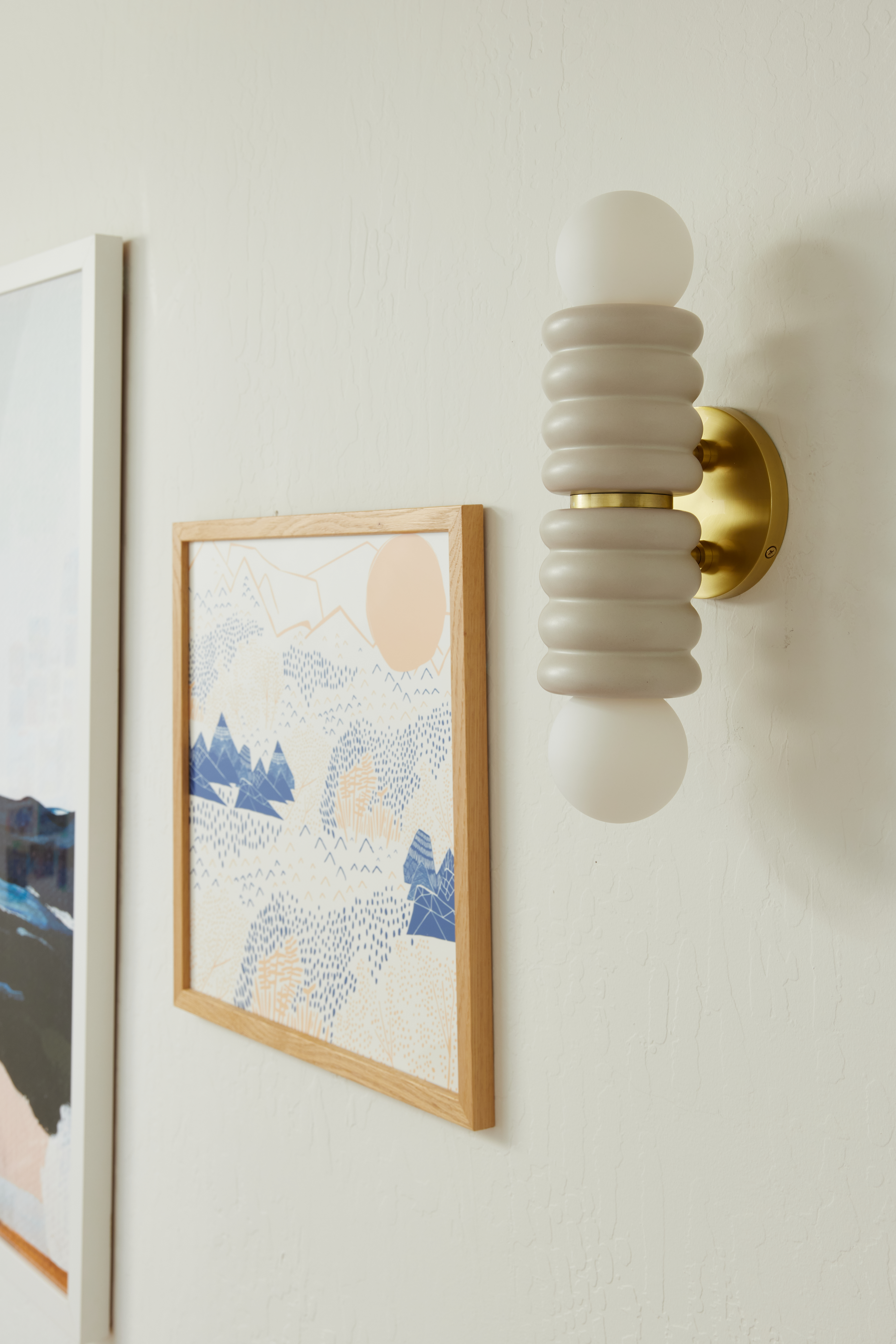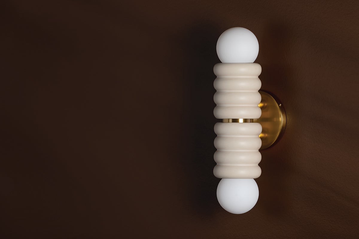 Bibi is soft, soothing, and simply stunning. Pillows of ceramic antique ivory stack to form the base of this contemporary design, inspired by the designer's upholstered BB stools. With its neutral palette and options, including a one- or two-light wall sconce, one-light flush mount, or one-light pendant, there's a place for this stylish and versatile piece in any room of the home.