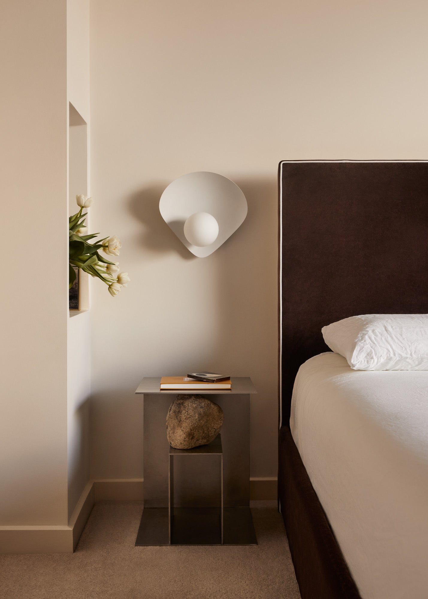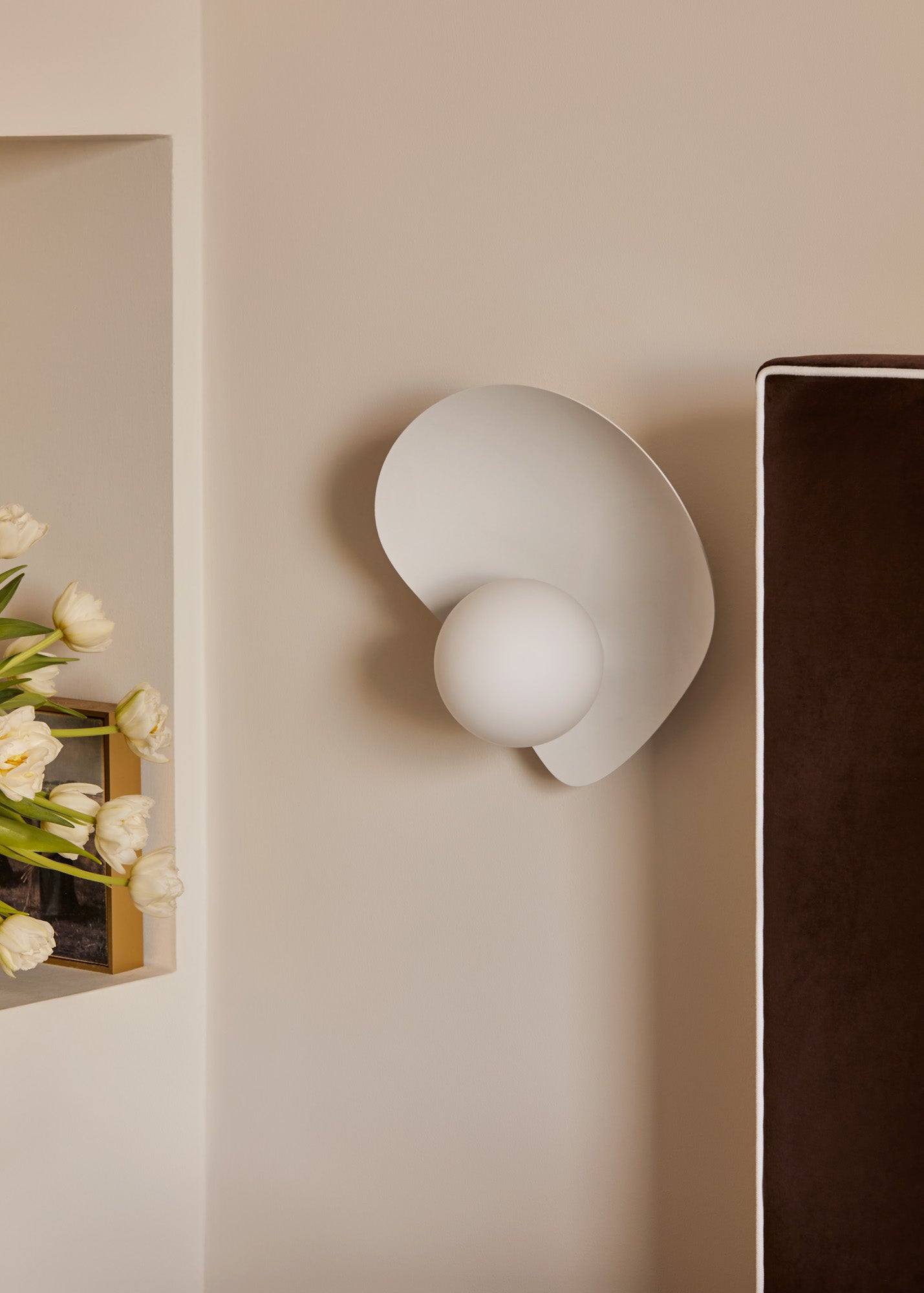 Beautiful and botanical, Leni features a petal-shaped shade that is chic and soothing. Light fills the shade and creates uplight, and the bulb underneath provides a bright glow that reflects beautifully off the textured white shade behind it. Available as a one-light wall sconce and five-light pendant, the monochromatic, all-white finish works well with a variety of interiors.