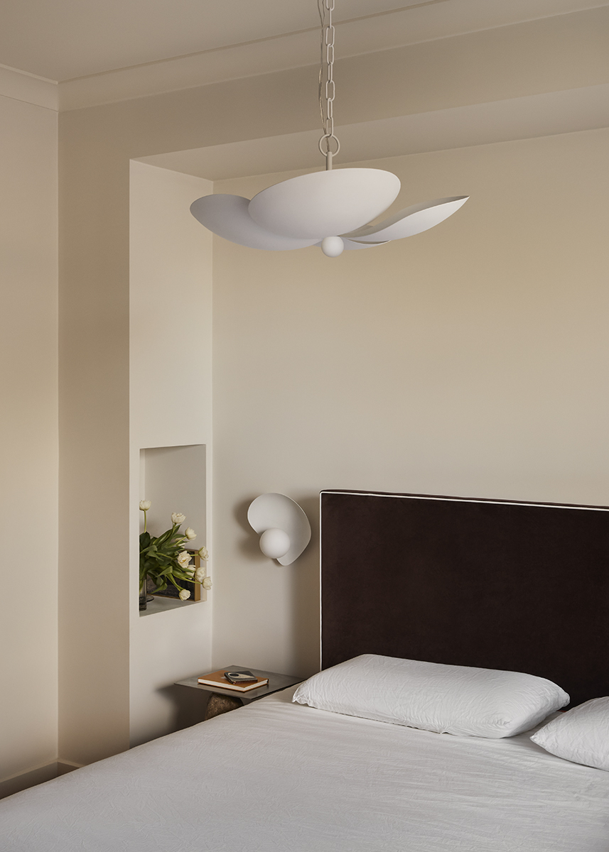 Beautiful and botanical, Leni features a petal-shaped shade that is chic and soothing. Light fills the shade and creates uplight, and the bulb underneath provides a bright glow that reflects beautifully off the textured white shade behind it. Available as a one-light wall sconce and five-light pendant, the monochromatic, all-white finish works well with a variety of interiors.