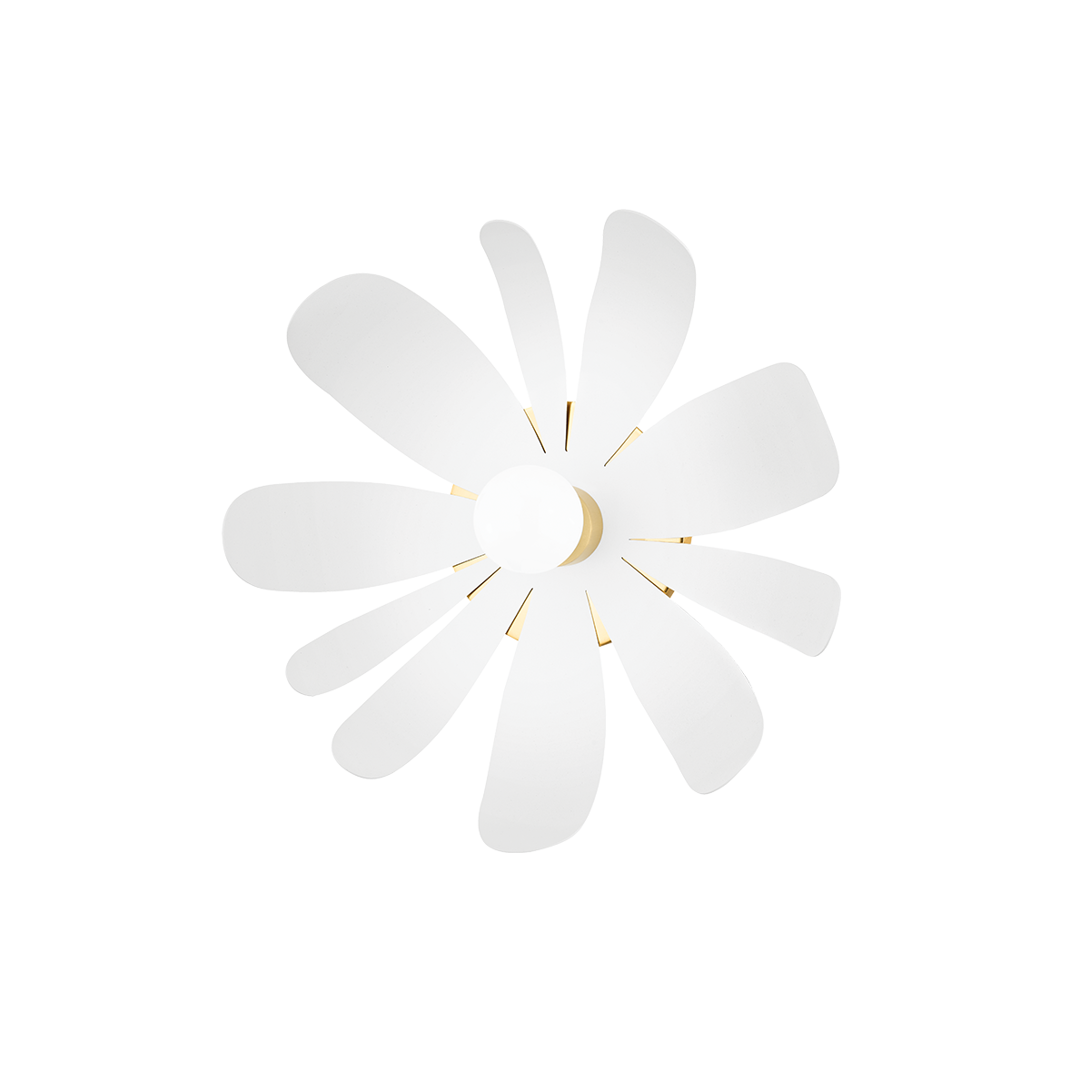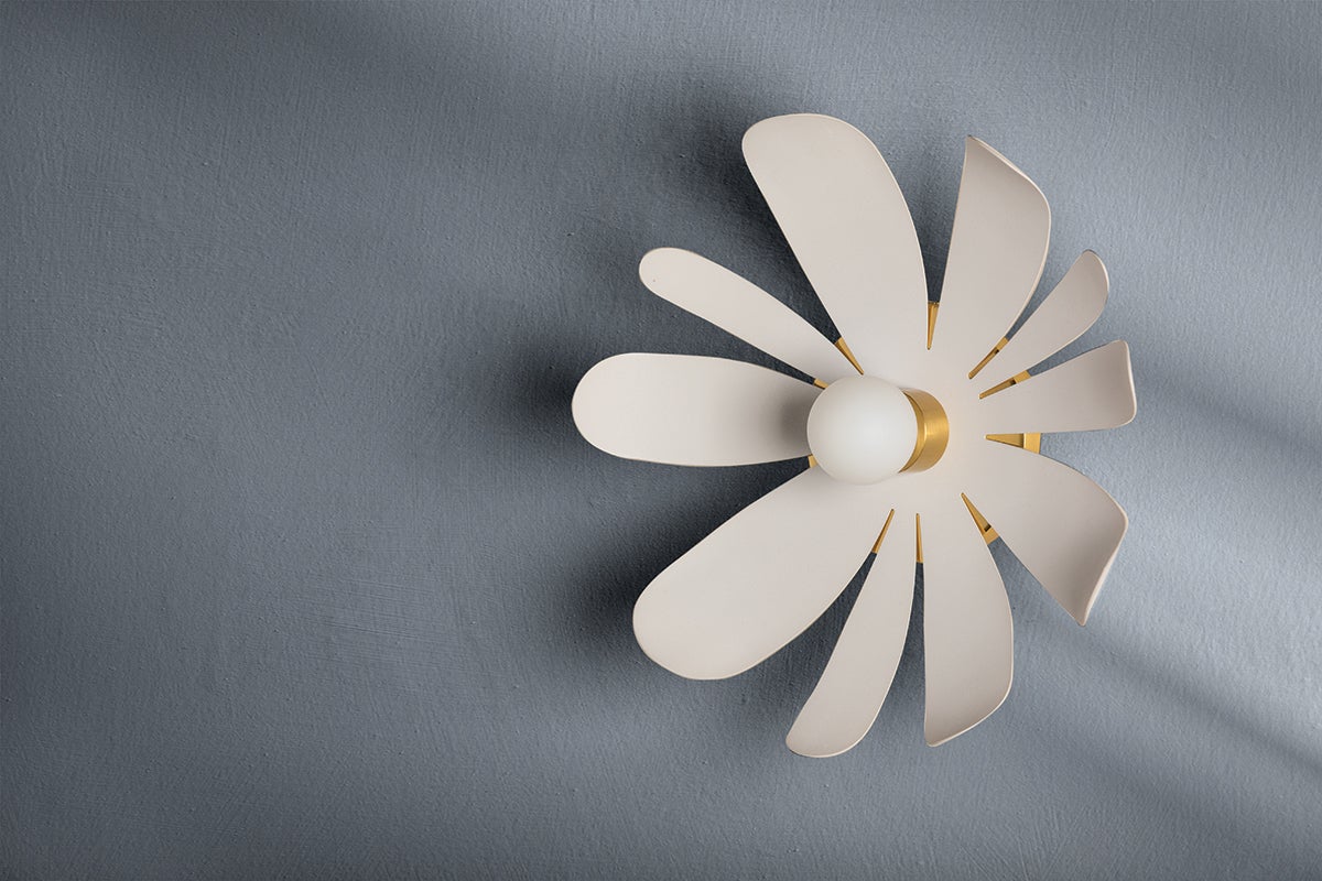 Pretty with a retro flair, Twiggy is floral inspiration at its finest. Different-sized textured white petals sprout from a petite opal matte bulb at the center. The aged brass accents add a pop of shine without taking away from the piece's organic feel. Twiggy offers an entire bouquet of options including a one- or three-light wall sconce, a 3-light semi flush and a 3-light floor lamp.