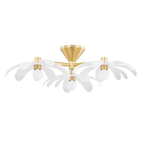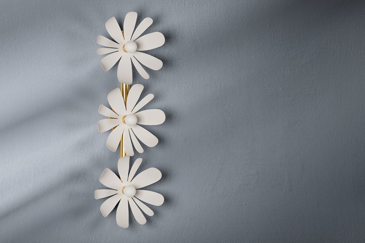 Pretty with a retro flair, Twiggy is floral inspiration at its finest. Different-sized textured white petals sprout from a petite opal matte bulb at the center. The aged brass accents add a pop of shine without taking away from the piece's organic feel. Twiggy offers an entire bouquet of options including a one- or three-light wall sconce, a 3-light semi flush and a 3-light floor lamp.