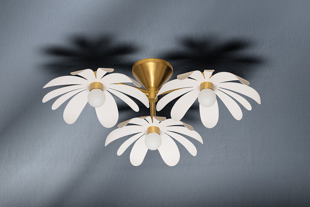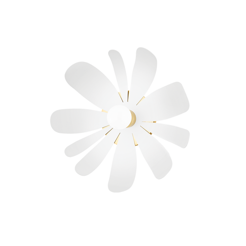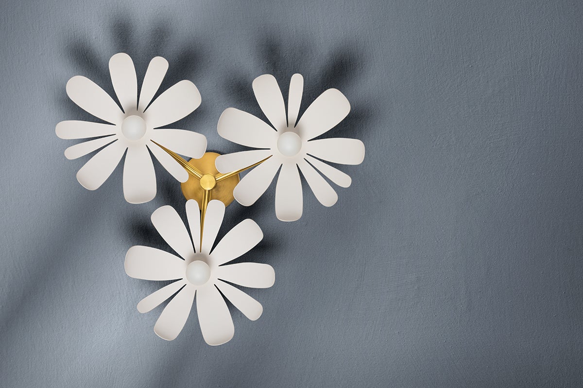 Pretty with a retro flair, Twiggy is floral inspiration at its finest. Different-sized textured white petals sprout from a petite opal matte bulb at the center. The aged brass accents add a pop of shine without taking away from the piece's organic feel. Twiggy offers an entire bouquet of options including a one- or three-light wall sconce, a 3-light semi flush and a 3-light floor lamp.
