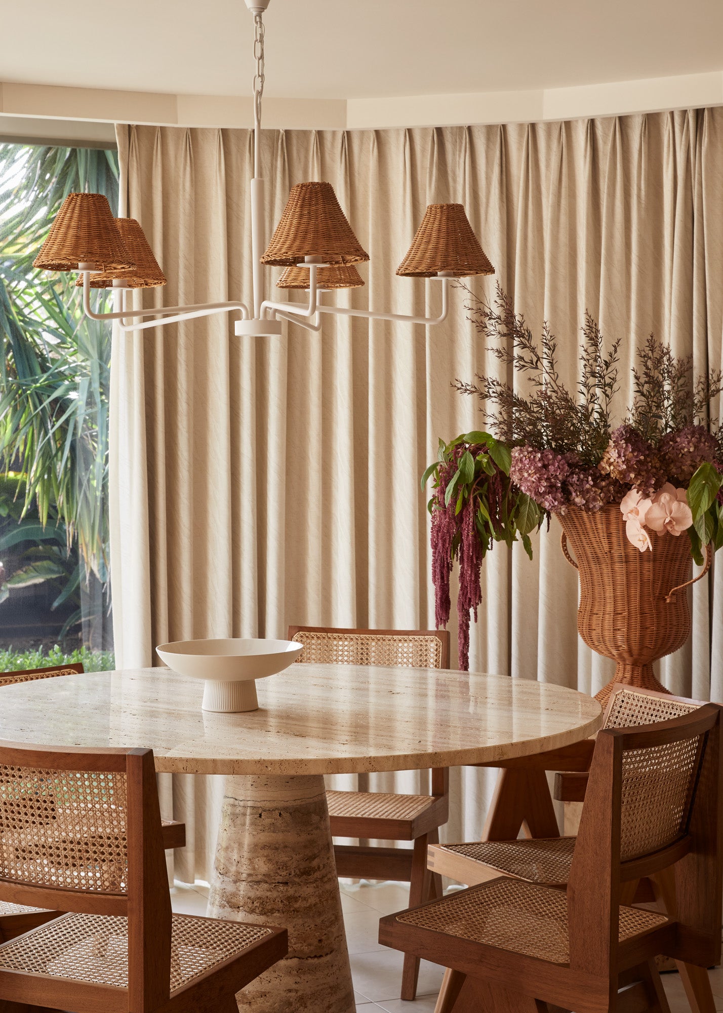 Issa has a natural style that's ahead of the curve. Slender, hooked arms hold a woven rattan shade that lets a soft light filter through. The aged brass or textured white finish is the perfect complement to the natural shade and adds to the fixture's overall earthy feel. Available as a chandelier, wall sconce or portable sconce, there's a place for Issa in every space.