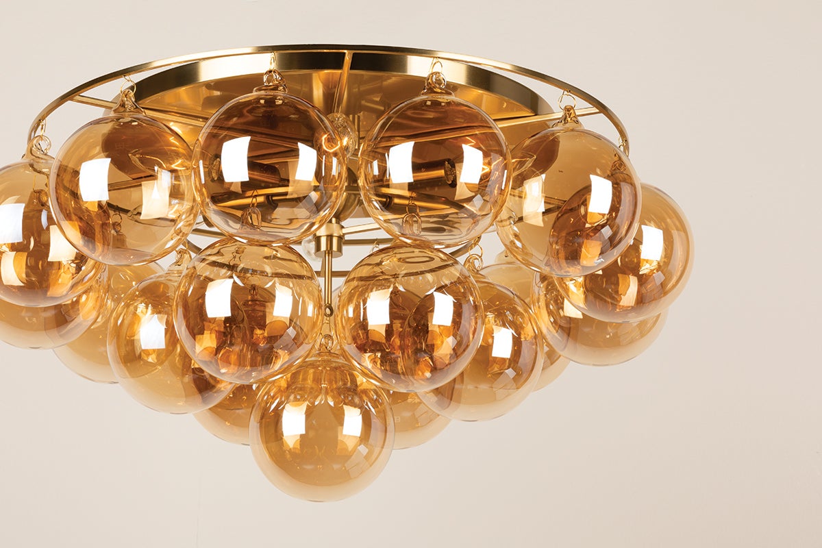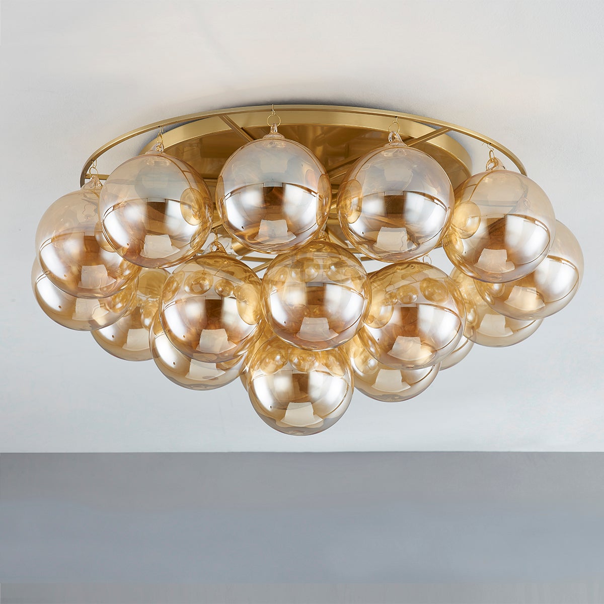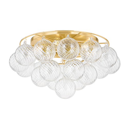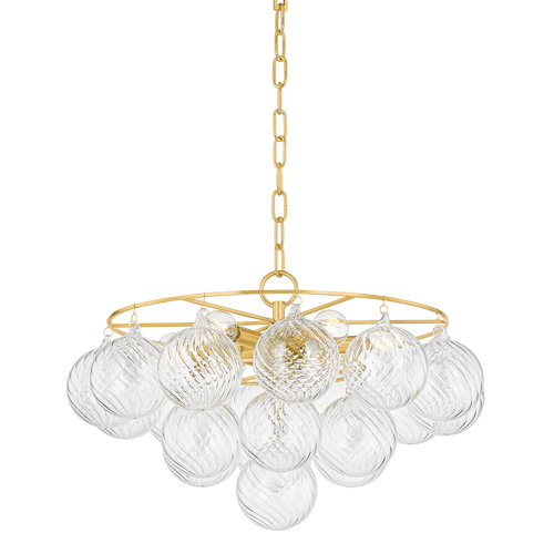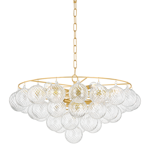 Swirl-ribbed or plated champagne glass globes dangle from an Aged Brass frame, creating this cloud-like showstopper. Whether you’re dressing up a breakfast nook with the small chandelier, adding a soft glow to an entryway with the flush mount, or making a glam statement in your dining room with the large chandelier, the possibilities for Mimi are endless. Part of our Megan Molten x Mitzi Tastemakers collection.