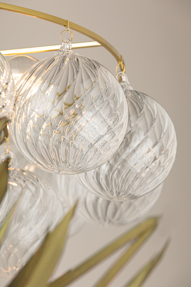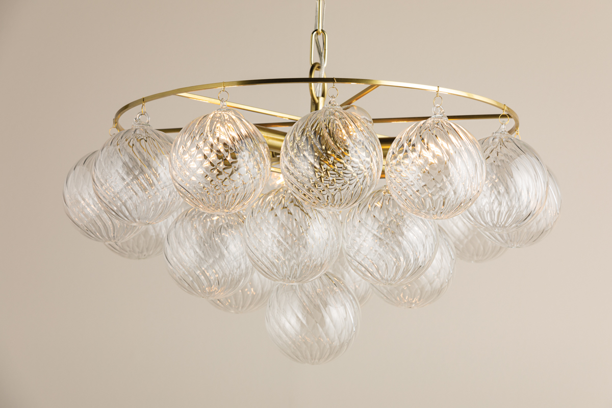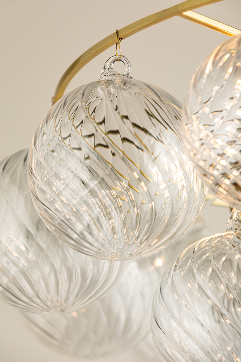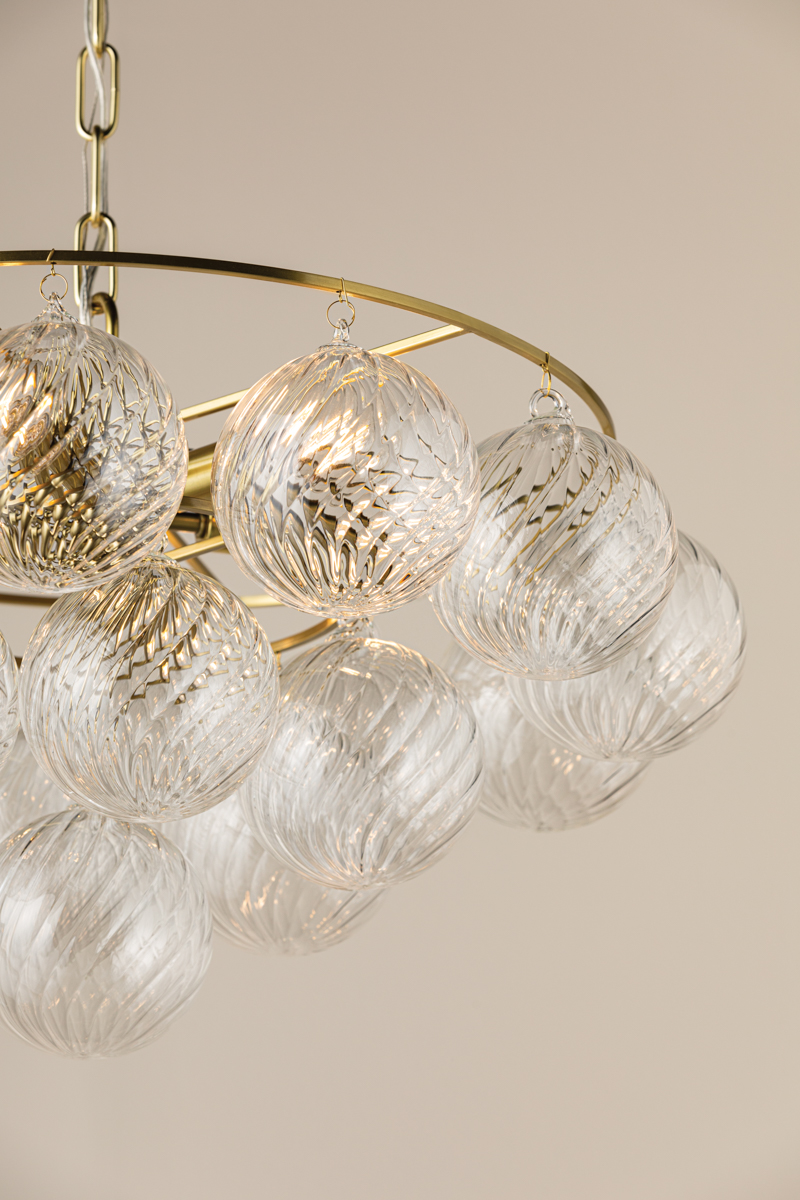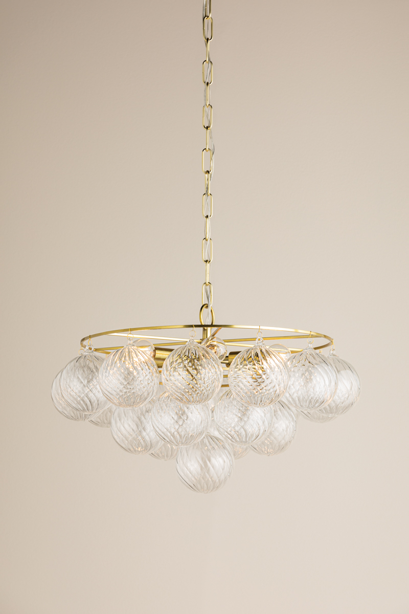 Swirl-ribbed or plated champagne glass globes dangle from an Aged Brass frame, creating this cloud-like showstopper. Whether you’re dressing up a breakfast nook with the small chandelier, adding a soft glow to an entryway with the flush mount, or making a glam statement in your dining room with the large chandelier, the possibilities for Mimi are endless. Part of our Megan Molten x Mitzi Tastemakers collection.