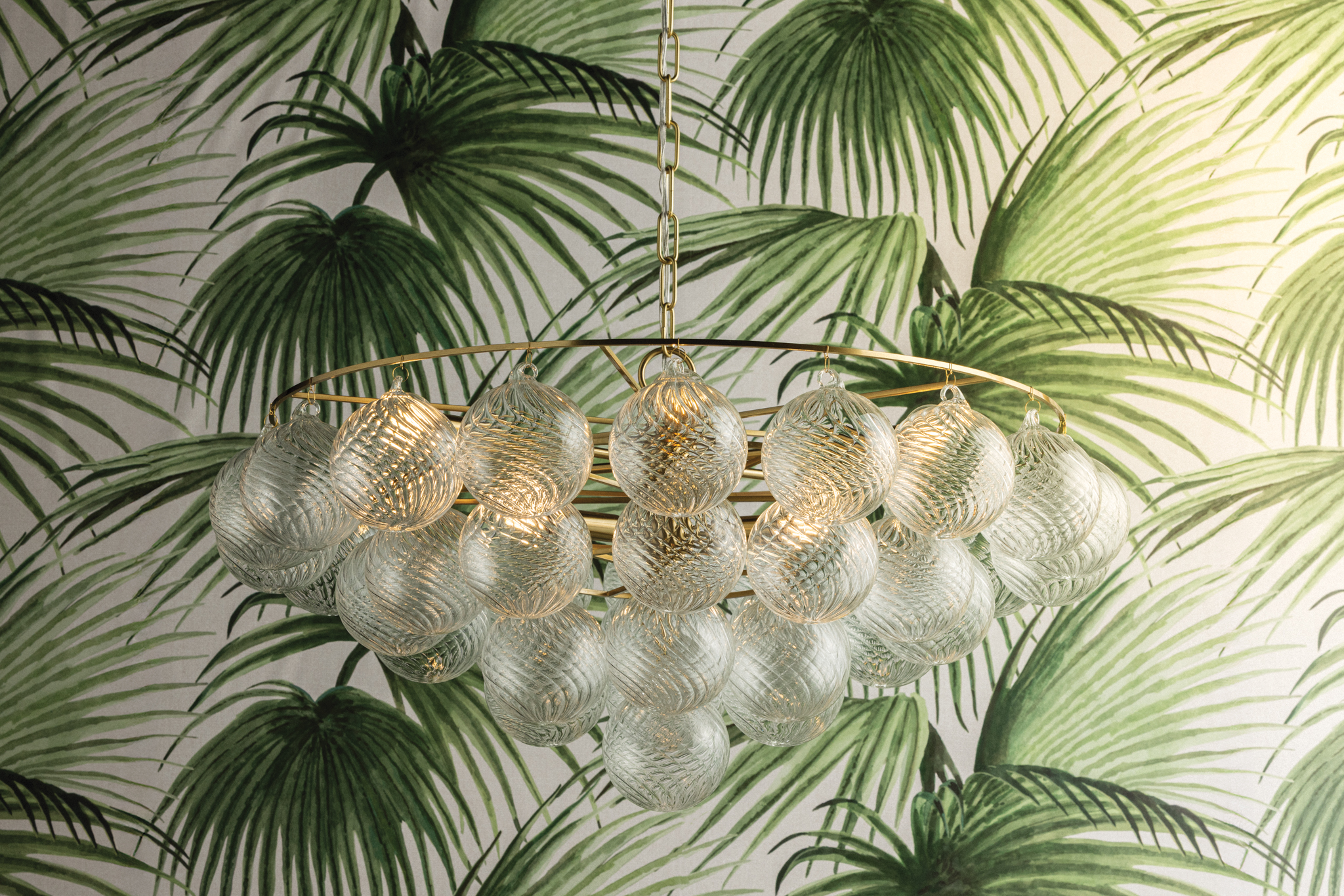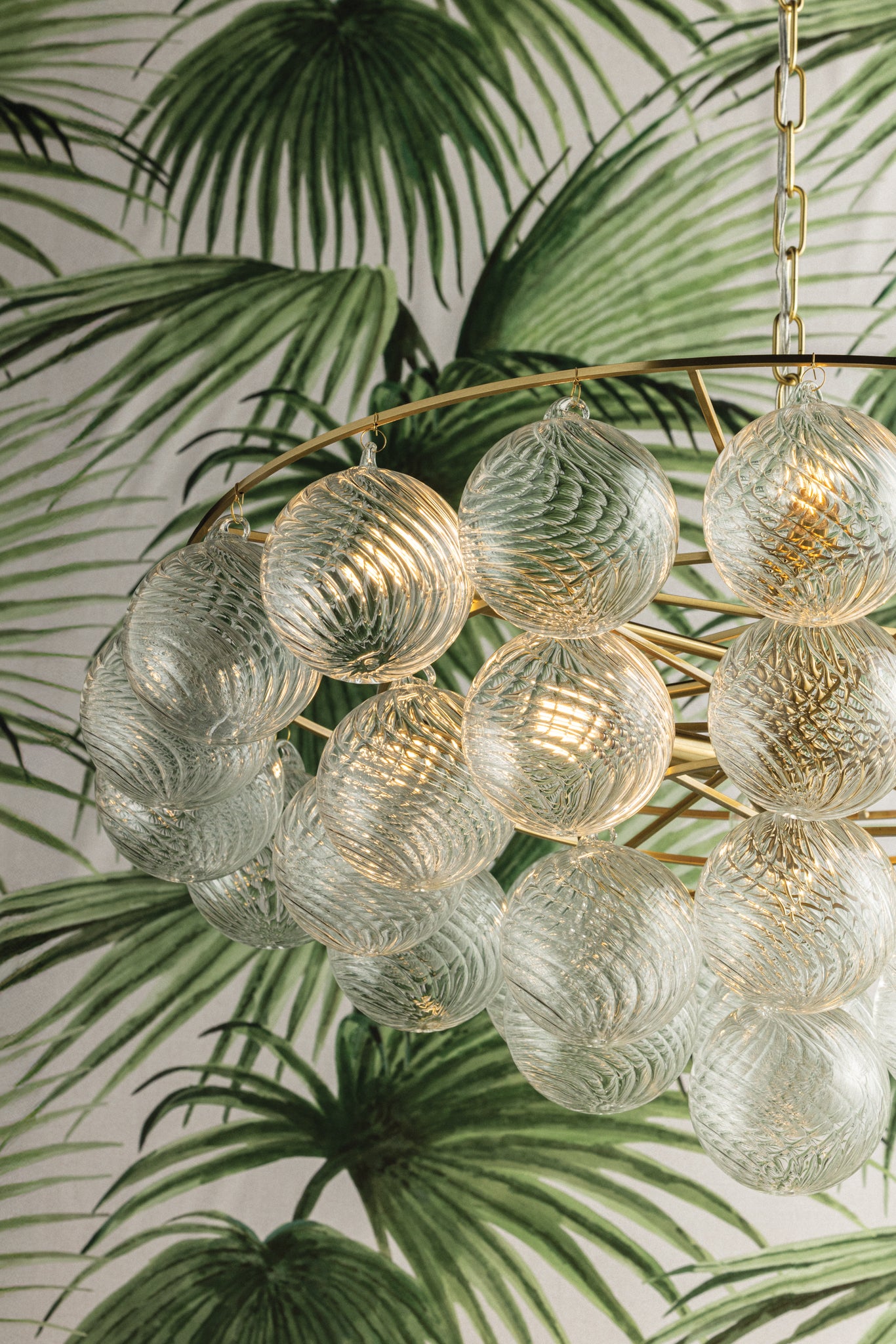 Swirl-ribbed or plated champagne glass globes dangle from an Aged Brass frame, creating this cloud-like showstopper. Whether you’re dressing up a breakfast nook with the small chandelier, adding a soft glow to an entryway with the flush mount, or making a glam statement in your dining room with the large chandelier, the possibilities for Mimi are endless. Part of our Megan Molten x Mitzi Tastemakers collection.