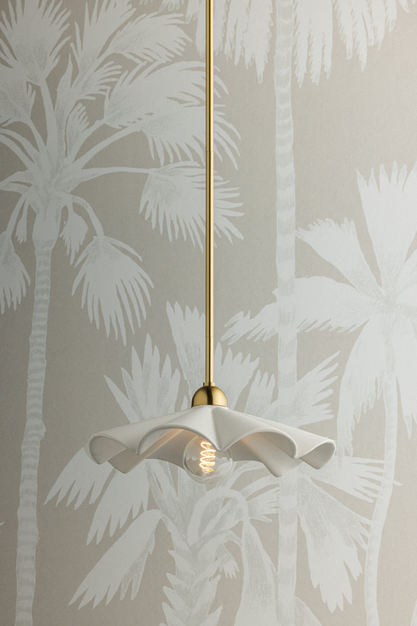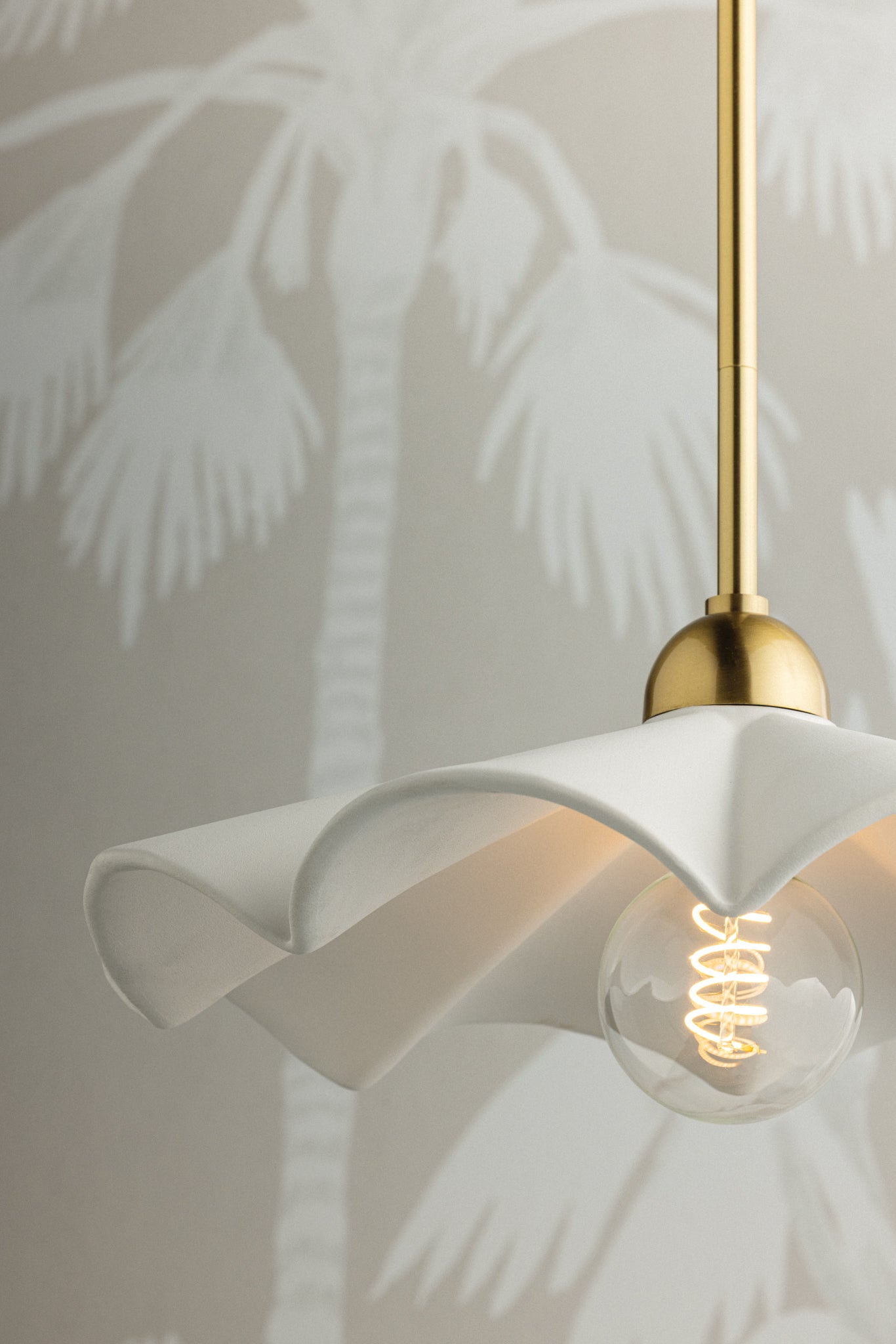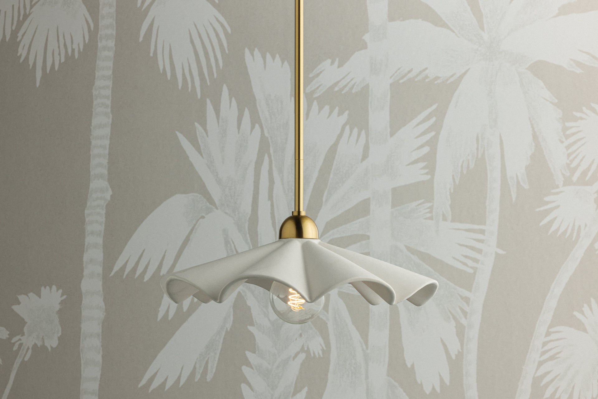 Fashionable and feminine, Maisie’s textured white ceramic ruffles give an organic coastal touch to this wave-inspired design. Create a beautiful yet functional dresser vignette with the table lamp, or add feminine flair to your bathroom vanity with pendants. Want in on a little secret? The pendant doubles as a semi-flush mount! Just remove the stem, and voila! A quick and easy refresh is just a twist away. Part of our Megan Molten x Mitzi Tastemakers collection.