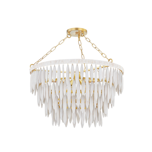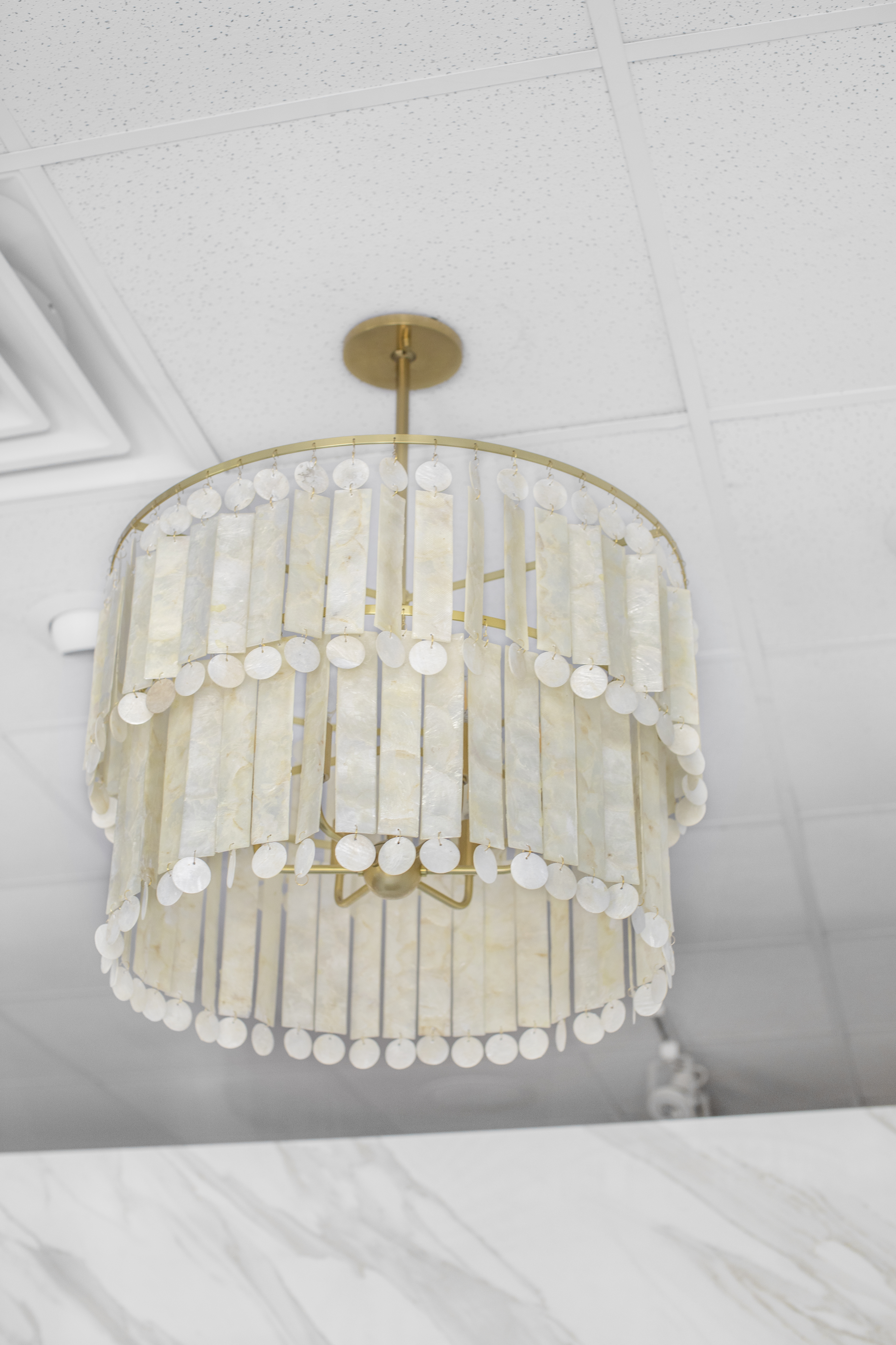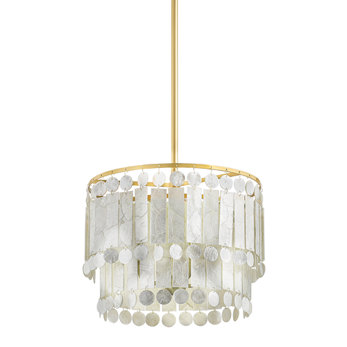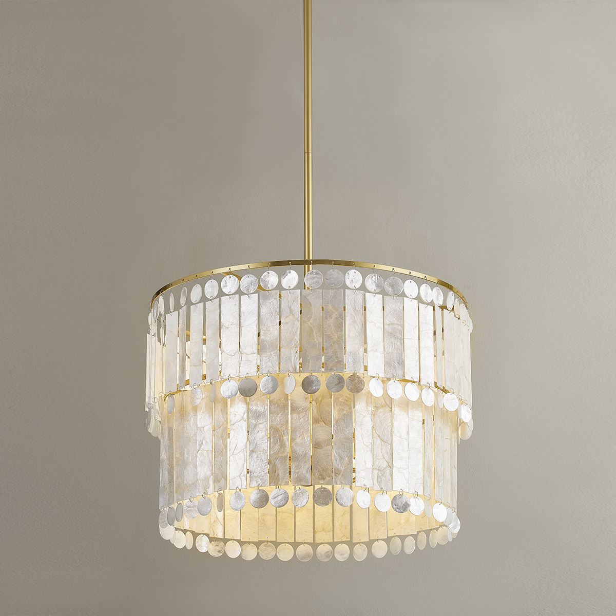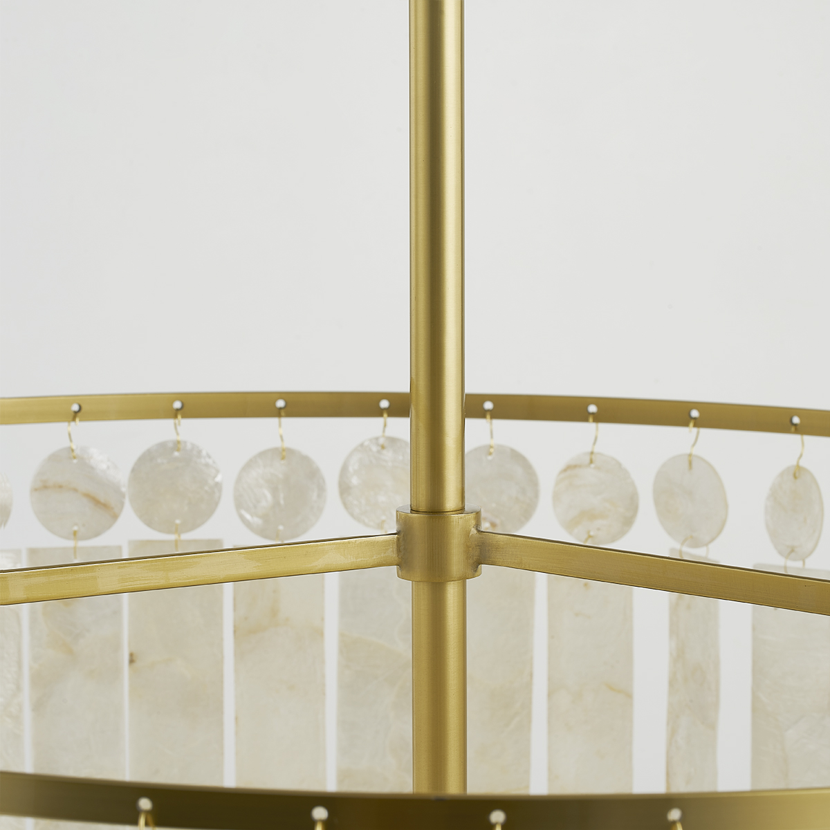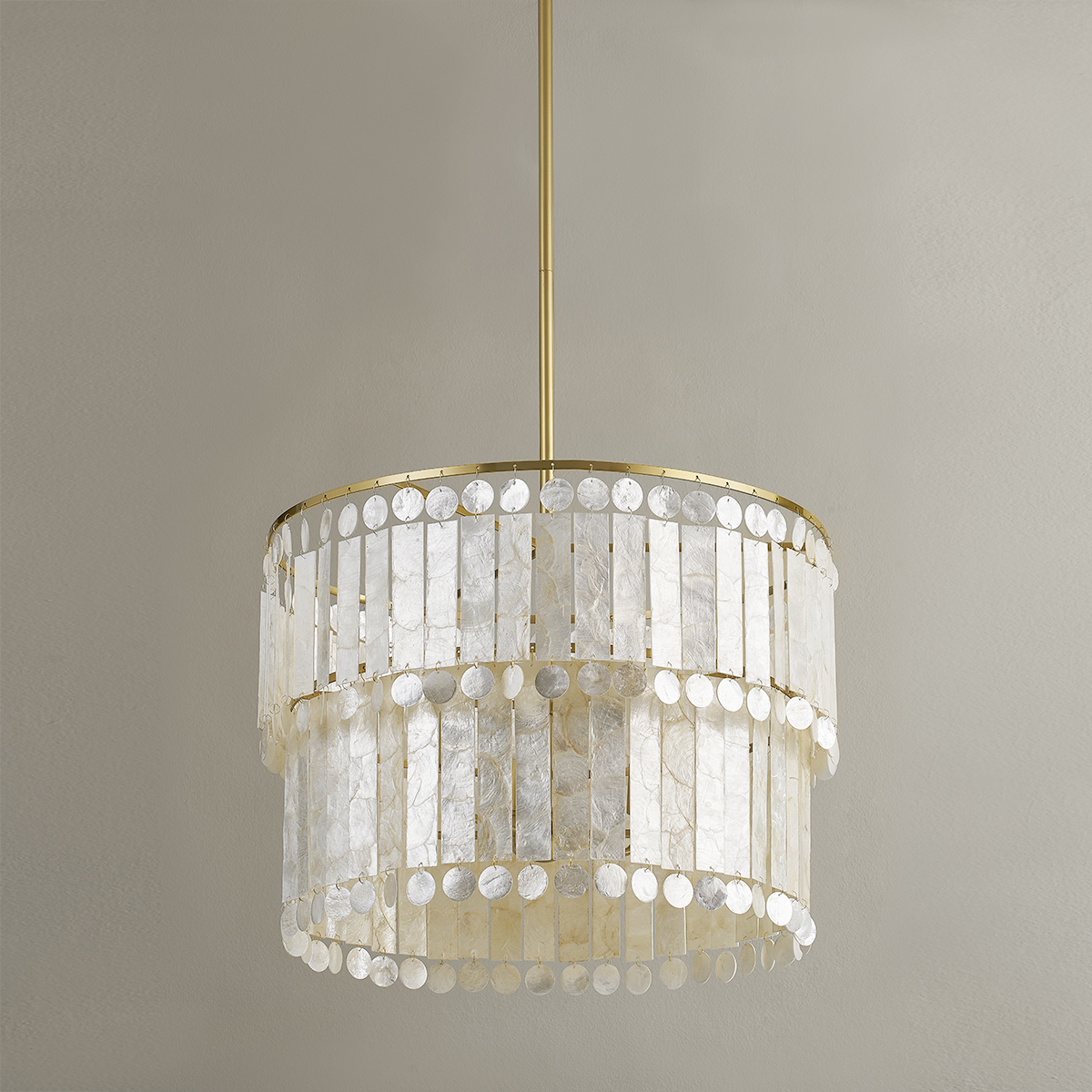 Gorgeous layers of Capiz shell, in alternating circles and rectangles, dangle from an Aged Brass frame for a sophisticated coastal aesthetic. This stunning design, available in a small and large chandelier, is the perfect centerpiece for your bedroom or living room update. Part of our Megan Molten x Mitzi Tastemakers collection.