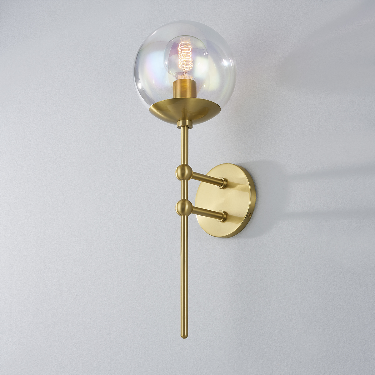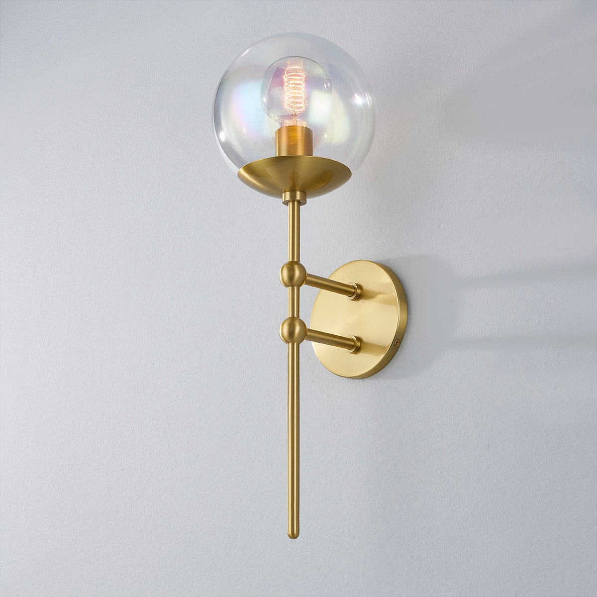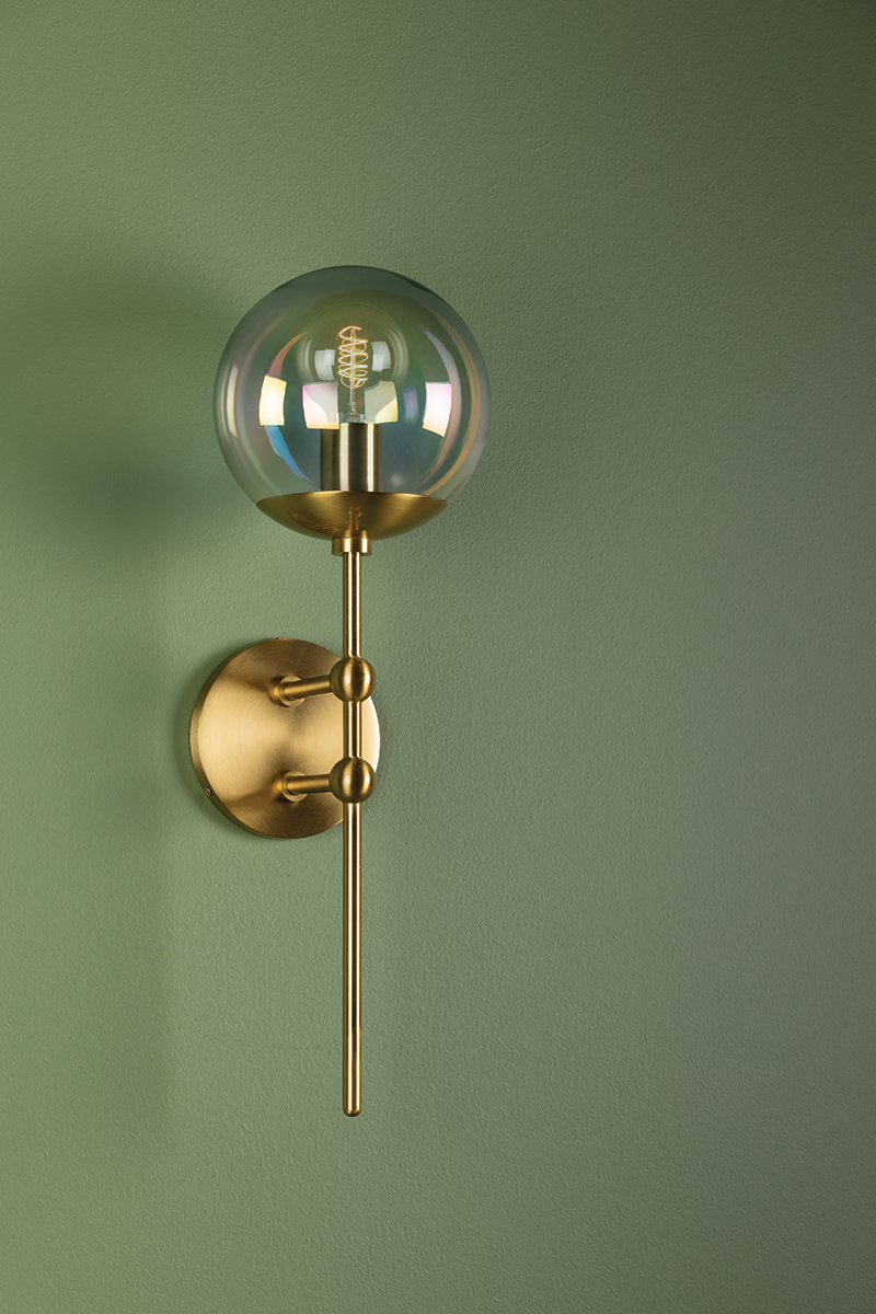 Ophelia is forward-thinking and fun. The combination of aged brass and iridescent glass globes is otherworldly, lending a softness to the wall sconce, island light, and chandelier.