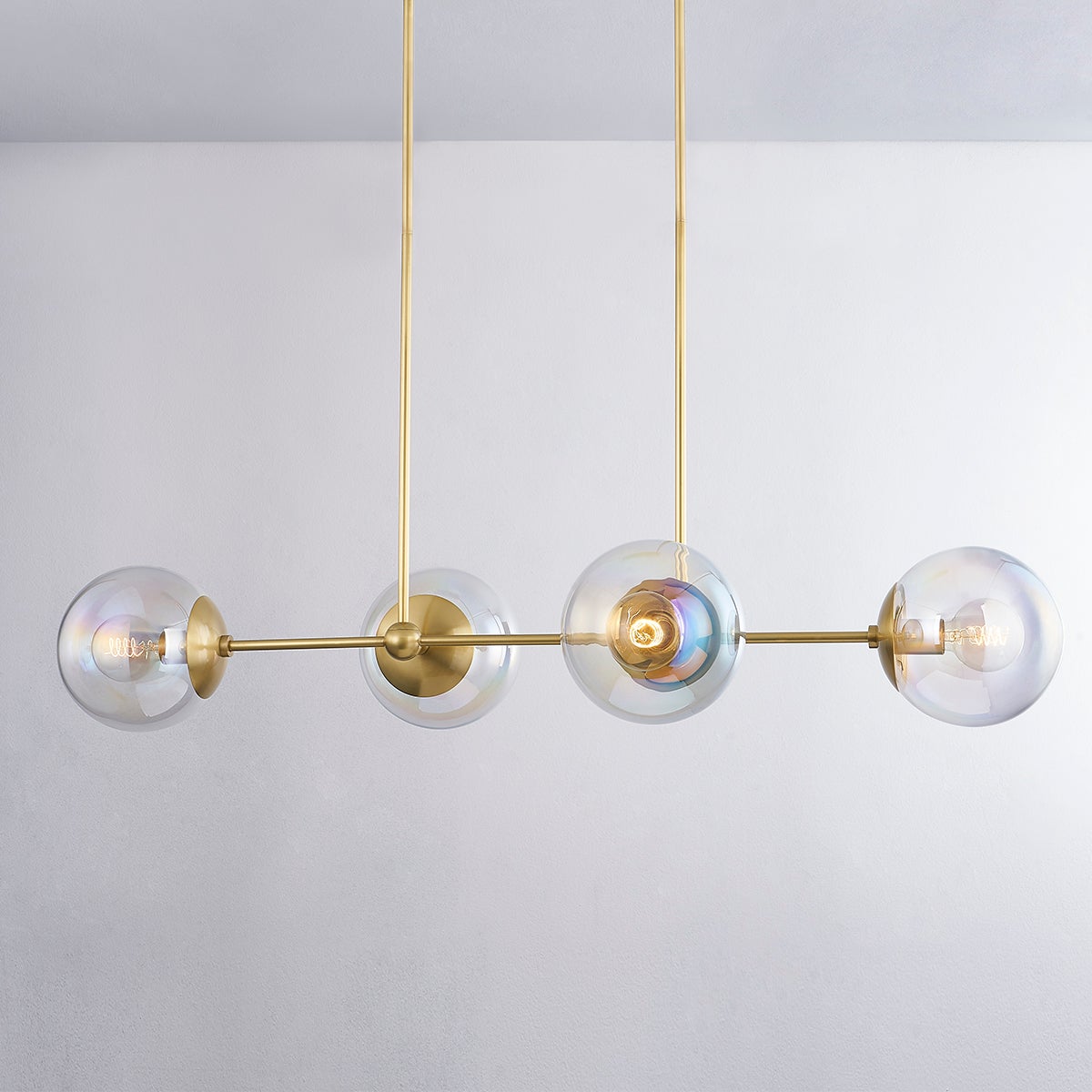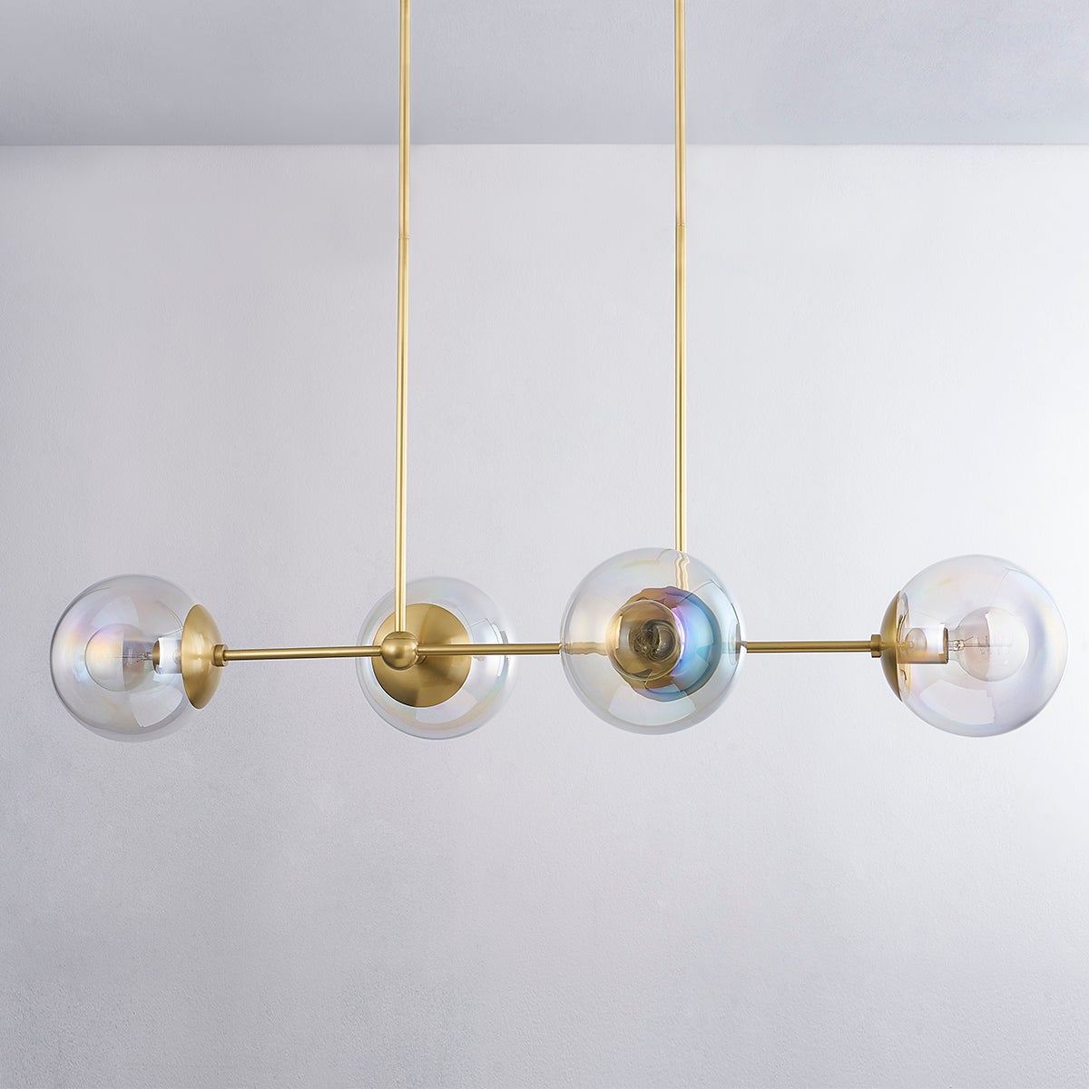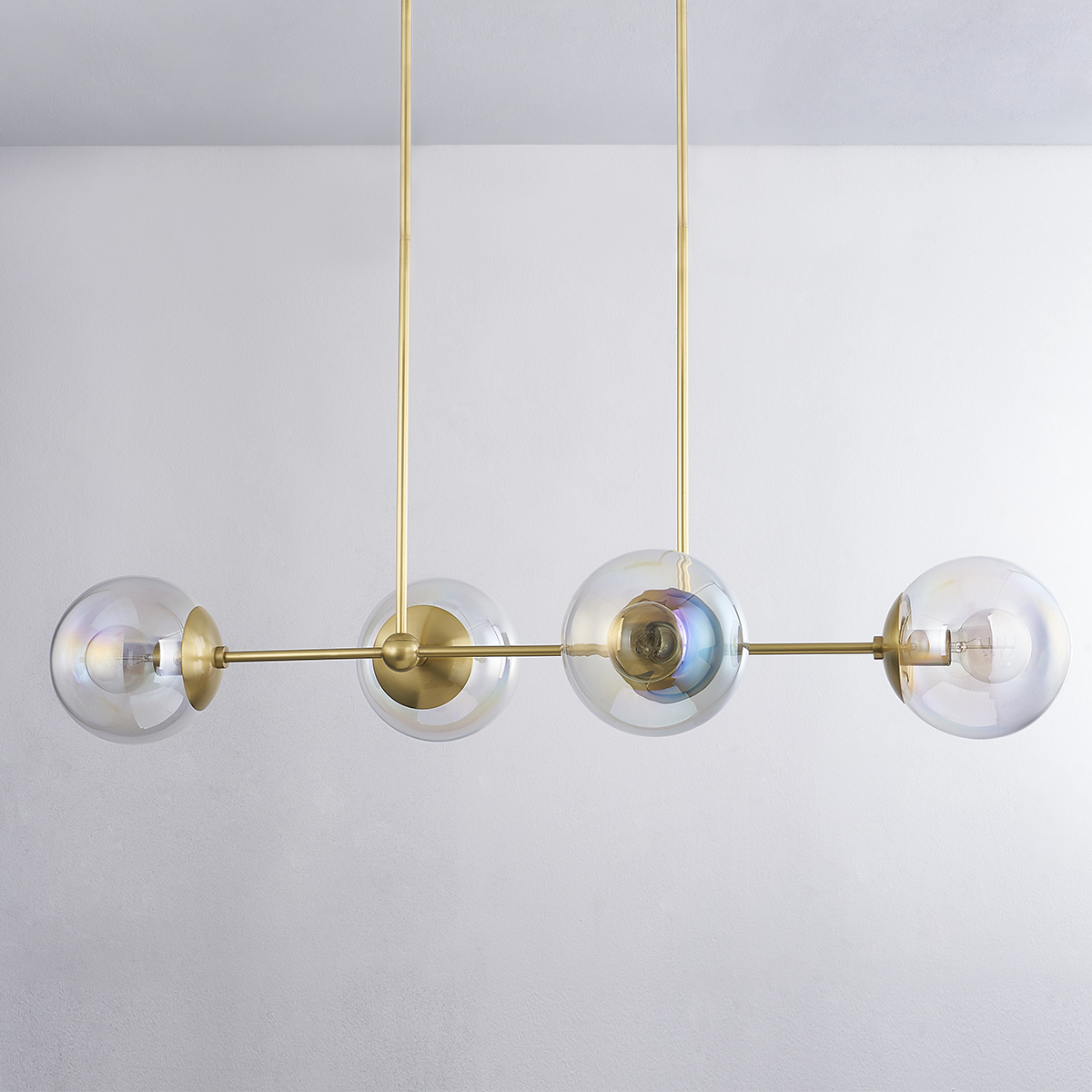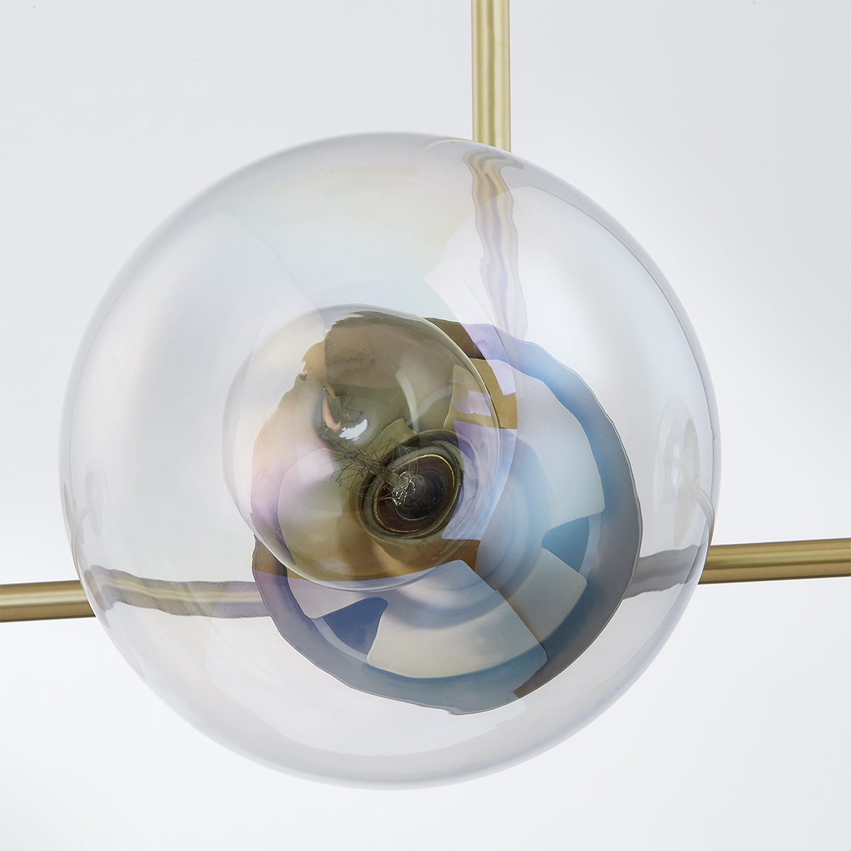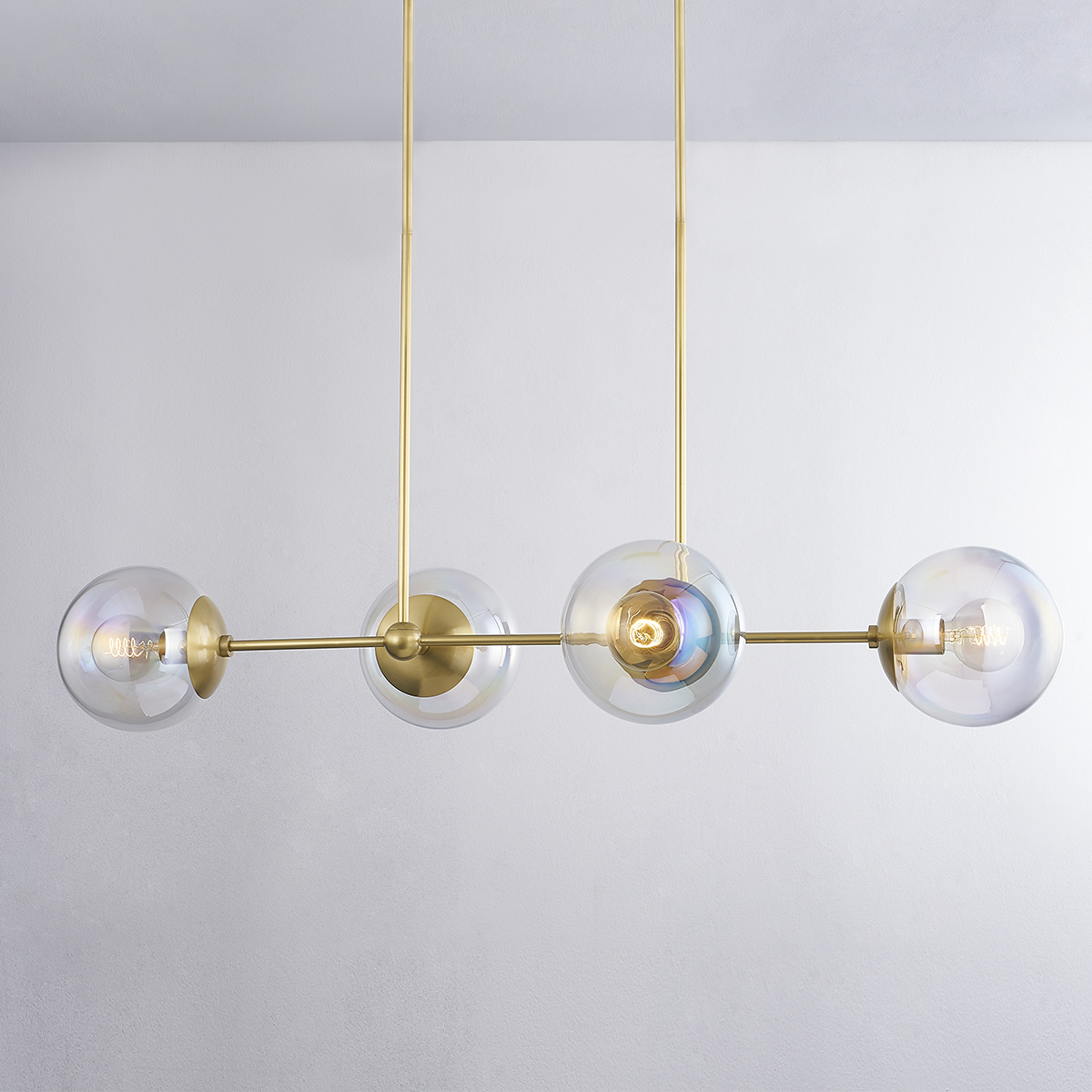 Ophelia is forward-thinking and fun. The combination of aged brass and iridescent glass globes is otherworldly, lending a softness to the wall sconce, island light, and chandelier.