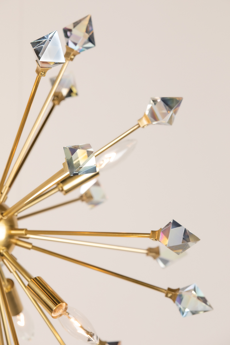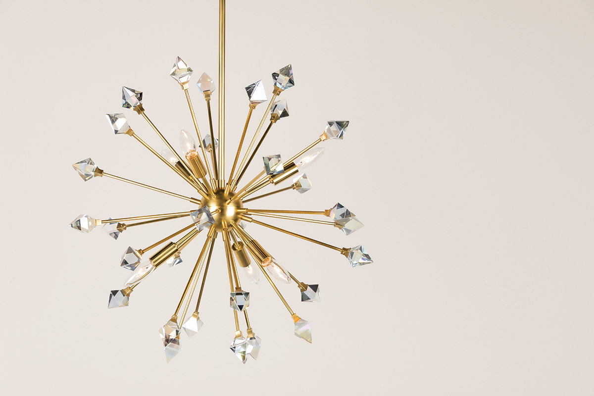 A Mid-century marvel, the sputnik style has captivated design fiends for decades. Genesis reimagines this icon, bringing celestial glamour in starburst form. Dancing between each light source are iridescent crystals, creating prisms of light throughout the room. Finished in aged brass, the Genesis Wall Sconce, Flush Mount, and Chandelier is the statement-making piece you need.