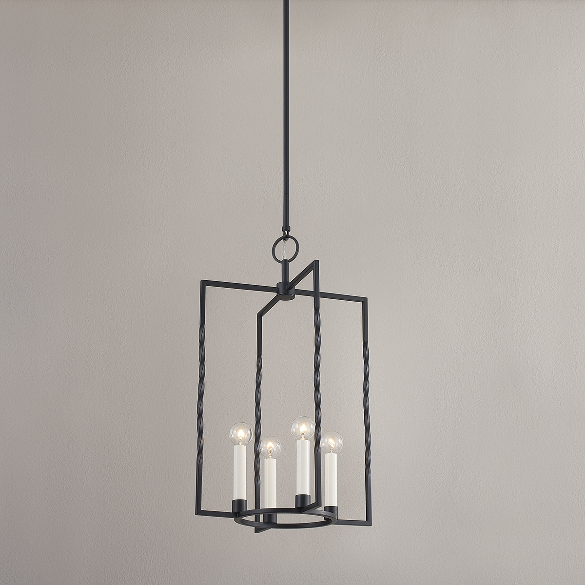 Vintage meets modern in Adelaide's romantic form. This 4-light lantern features a twisted metal frame in a textured black or vintage gold leaf finish. Circular forms near the top and bottom of the frame offset the clean edges, lending balance to the design. Candelabra style sockets reference antique design yet feel quite contemporary when paired with modern bulbs. Also available in a smaller size.