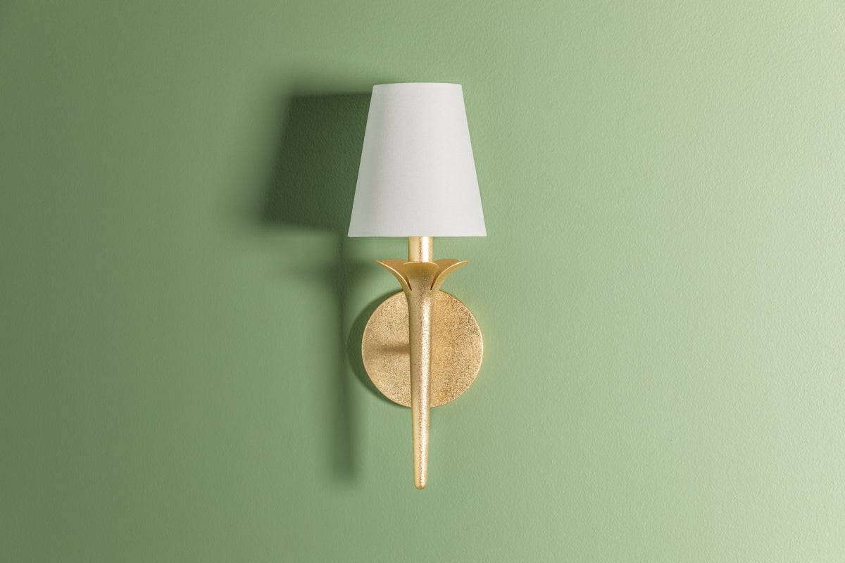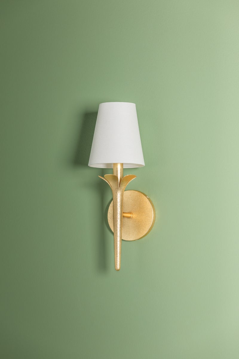 Slender Gold Leaf arms with pretty petal-like accents bring a warm, floral feeling to this sculptural design. Tapered white linen shades pair perfectly with the natural, organic vibe. Both the one-light sconce and the five-light chandelier will add a soft glow and a fresh style to any space.