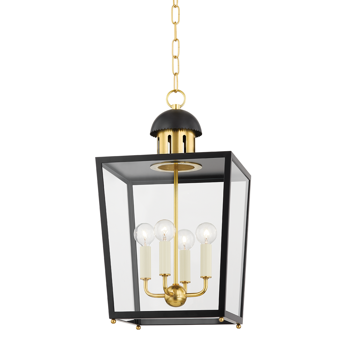 Old world meets new world in this luxe 4-light lantern. Aged brass and soft cream or balck are a delightful duo, complementing the regal frame. A miniature dome at the top of the frame features the most delicate scallop detail, lending a cottage vibe to the classic style. Also available in a larger size.