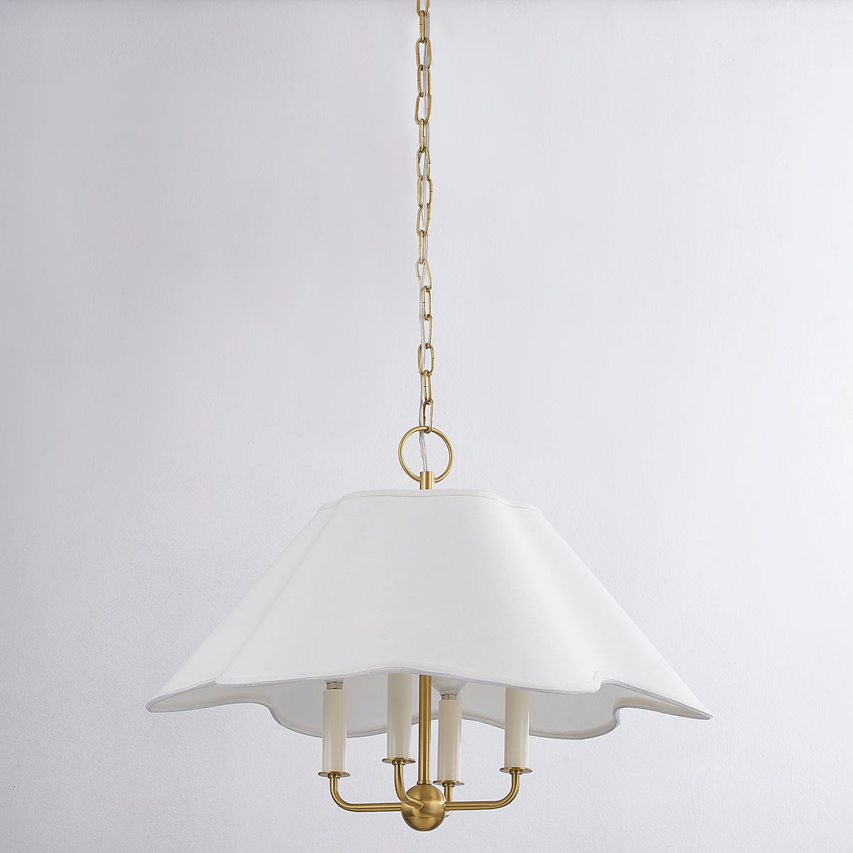 Rosanna takes a traditional form and reimagines it with feminine accents. Scalloping on the fabric shade feels fresh, breathing new life into the storied silhouette. The exposed candelabra base peeks through the shade, shining in a brilliant aged brass finish.