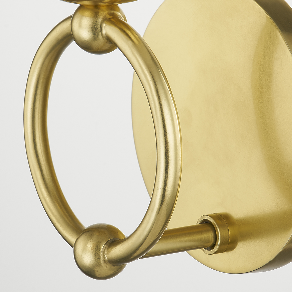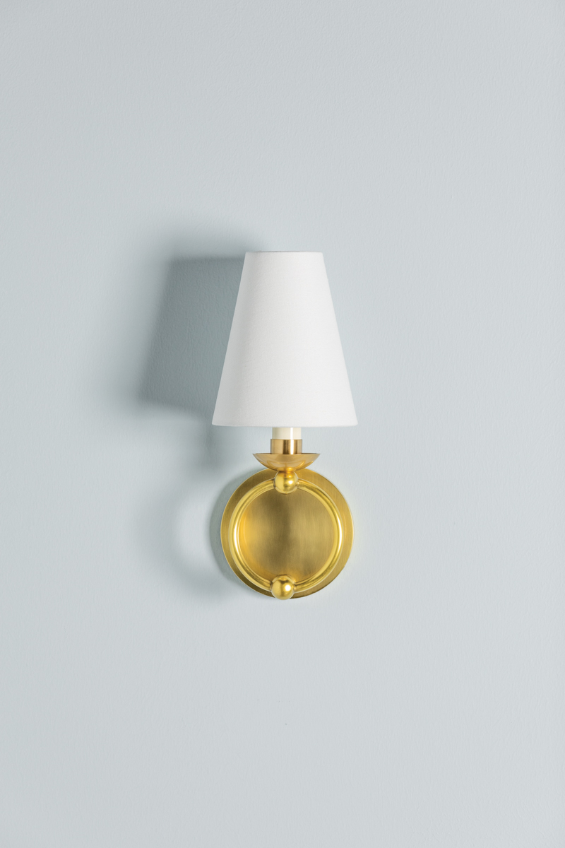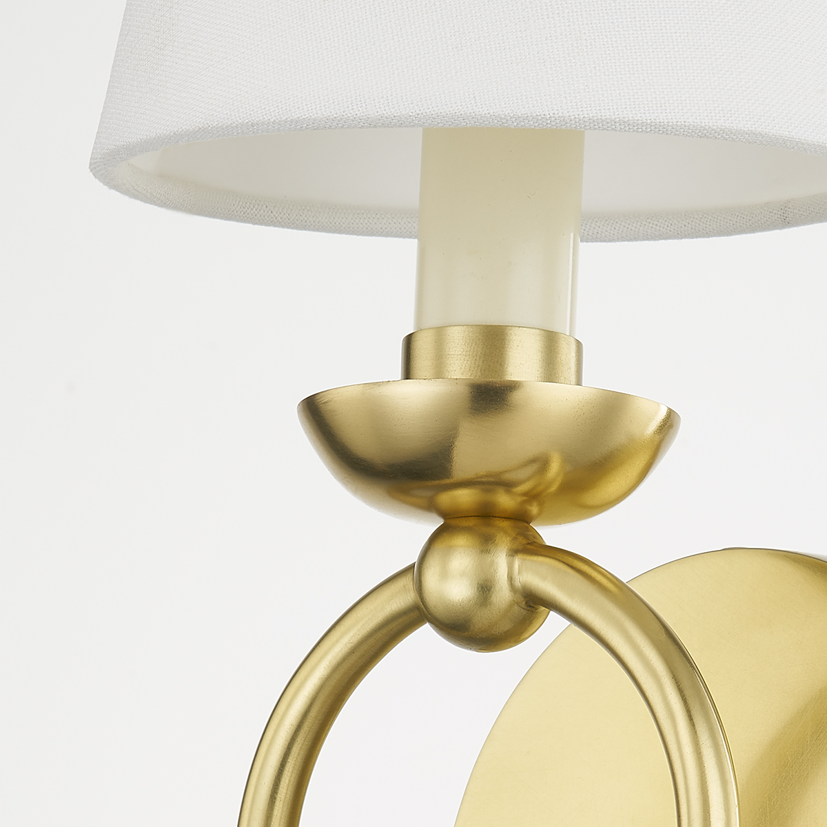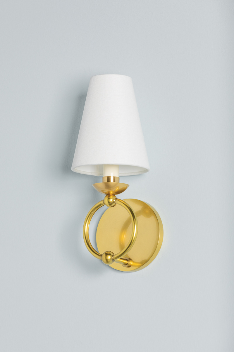 Clean and classic, Haverford has traditional appeal, with crisp white linen shades, streamlined candlesticks, and equestrian-inspired ring details. The chandelier's finish mix of Texture Black and Aged Brass adds elegance over the dining table and the Aged Brass sconce brings a warmth to walls throughout the home. Part of our Ariel Okin x Mitzi Tastemakers collection.