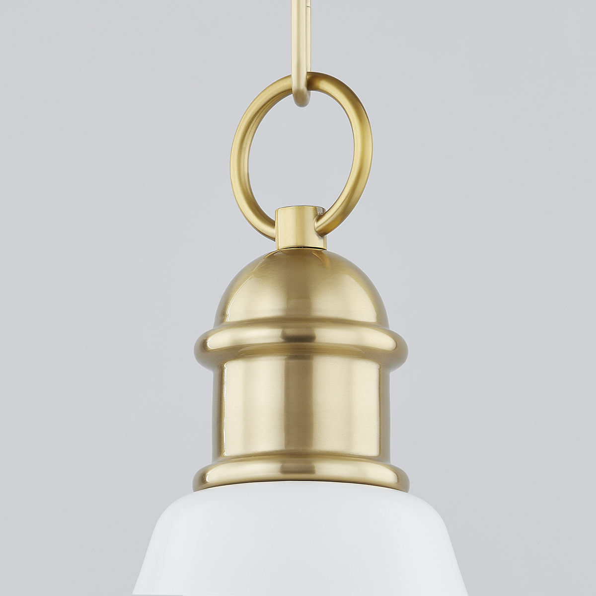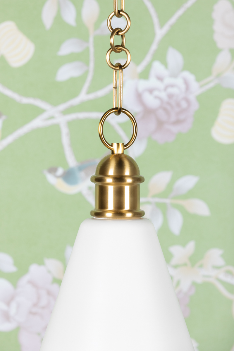 Fenimore's timeless conical silhouette is elevated through details like the elegant shade topper and intricate chainwork. The metal shade is Aged Brass on the inside and painted on the outside in Soft White or a signature Soft Blue hue created specifically for this designer collaboration. Part of our Ariel Okin x Mitzi Tastemakers collection.