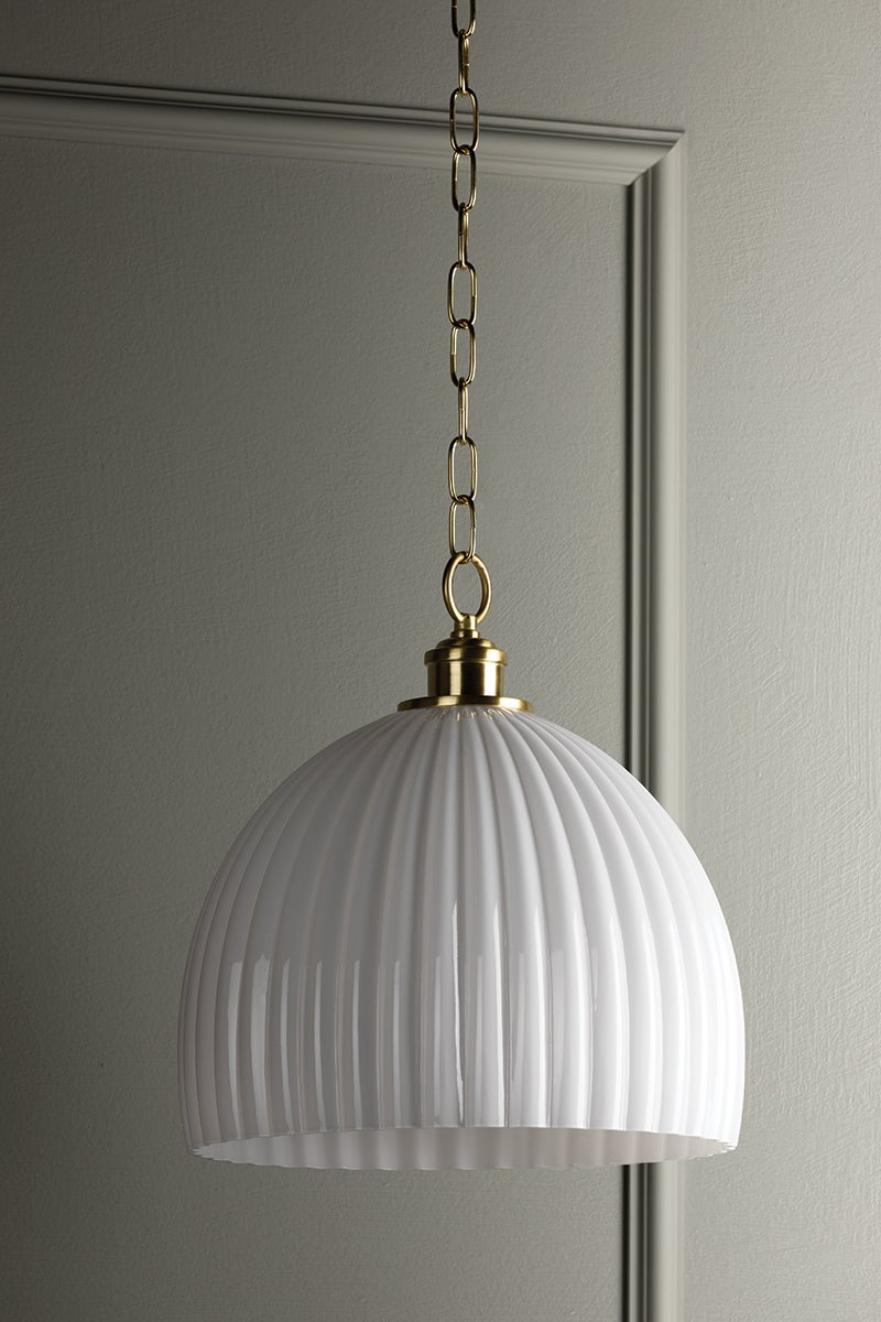 Hillary captures the cottage charm captivating the design world. The single light pendant, available in aged brass and old bronze features a fluted glass shade dangling elegantly from the chain. Stunning on its own, this antique darling proves better in pairs, layered in multiples over a kitchen island or dining scene. Also available in a smaller size.